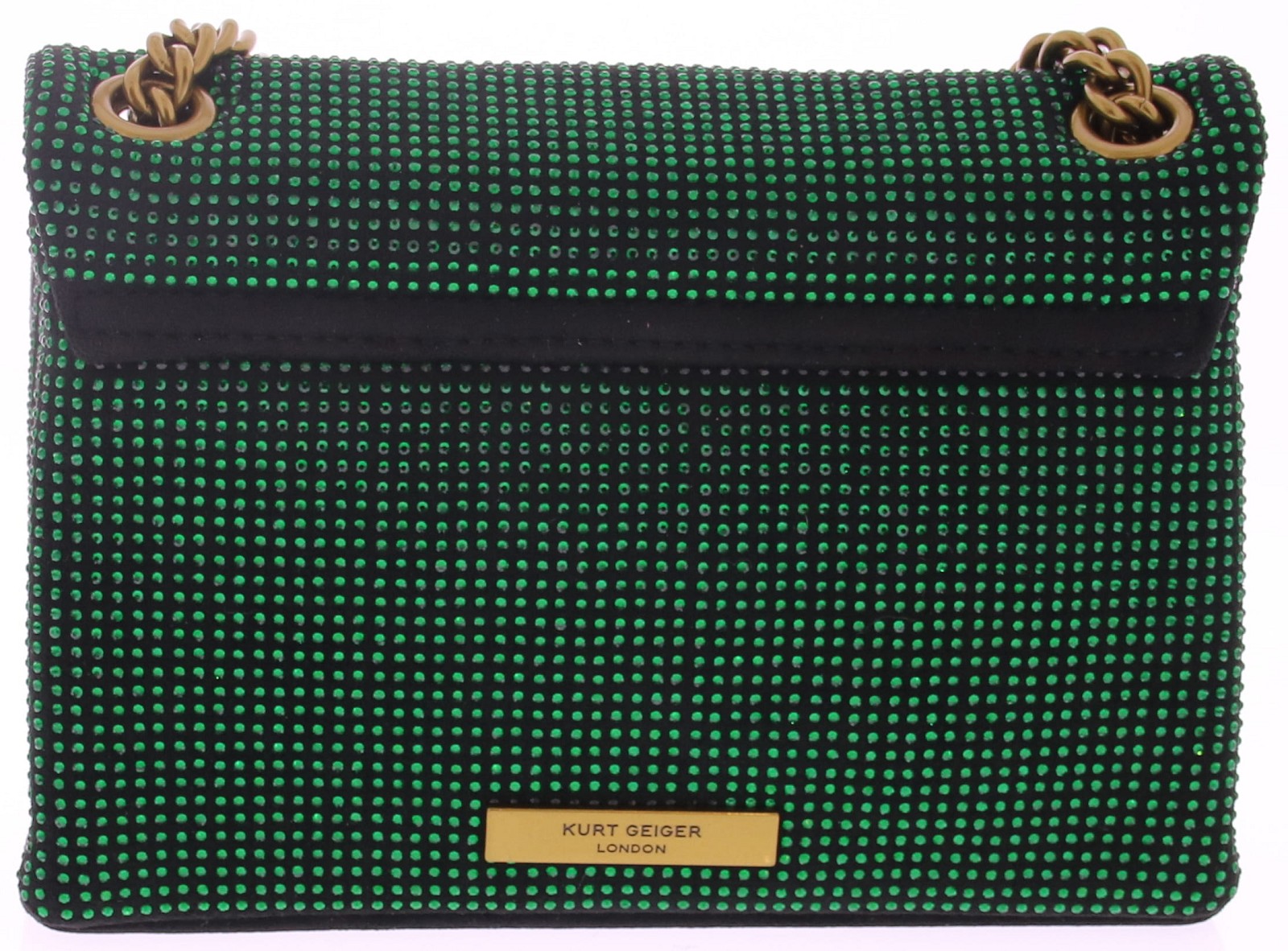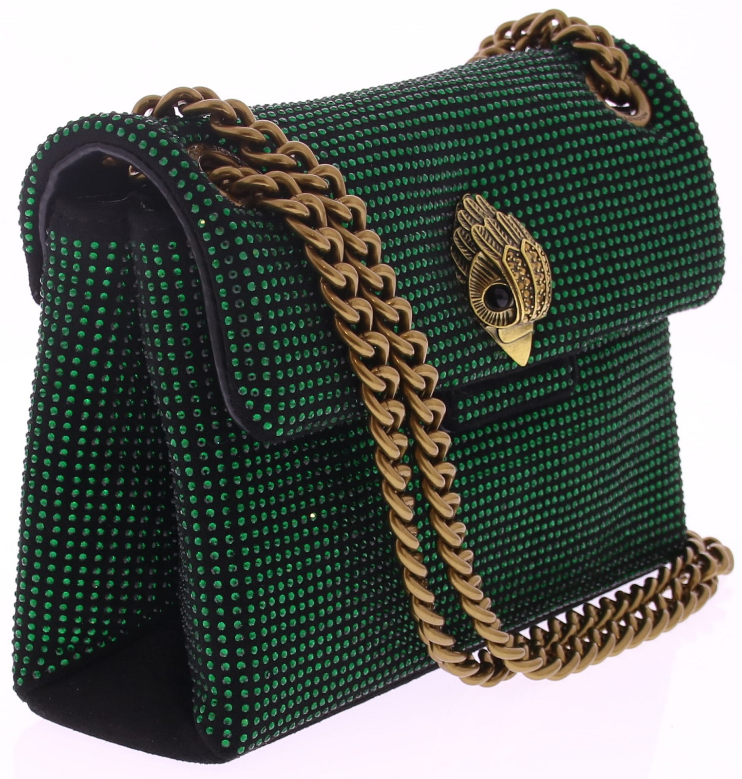This green Kurt Geiger crystal-encrusted women's fabric bag features a gold-colored eagle head adorned with opaque copper crystals and black beaded eyes. The bag closes with a magnetic snap button hidden under the front flap. The bag measures 14 cm (H), 20 cm (L), and 6 cm (D). The gold-colored chain shoulder strap is 60 cm long.