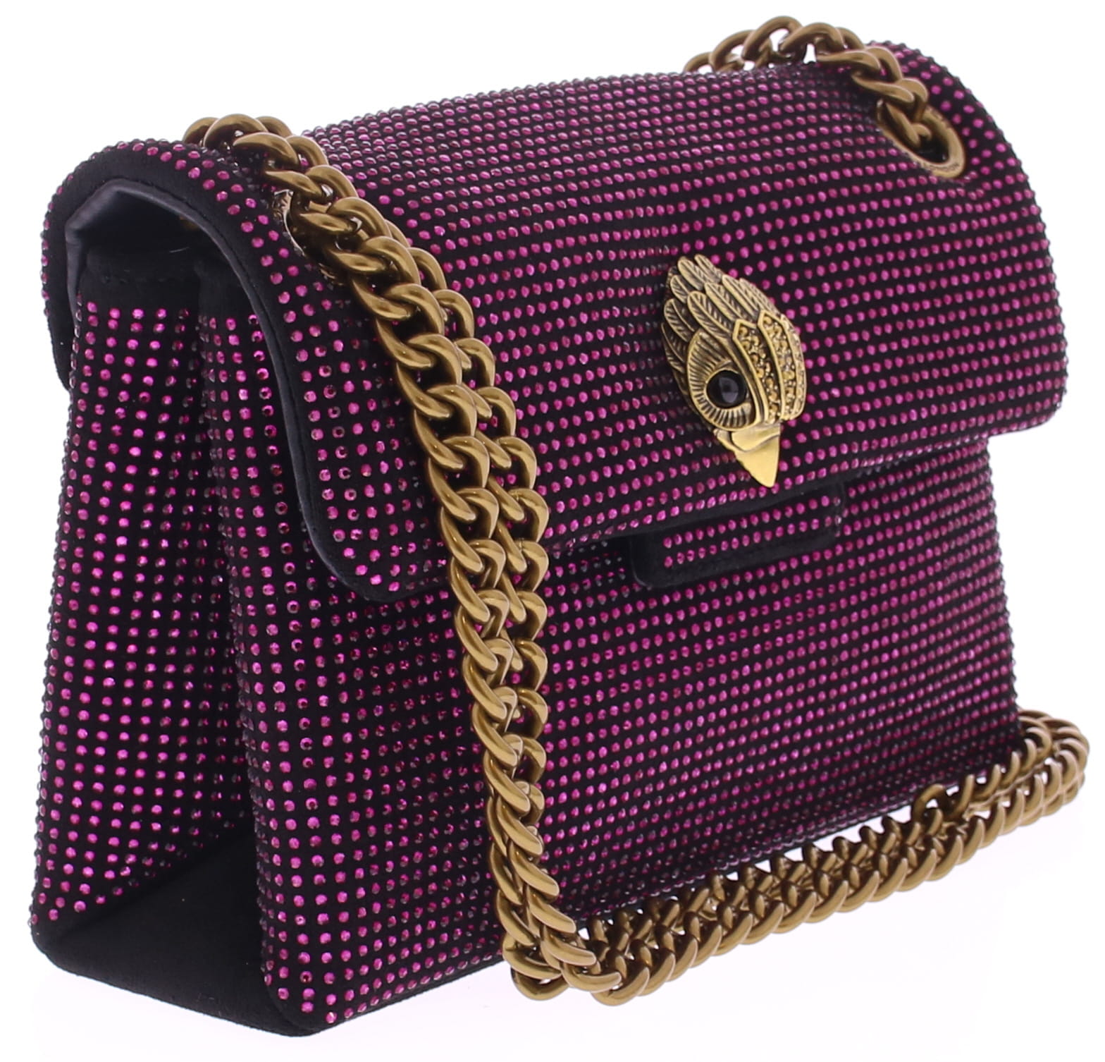 Fuchsia fabric women's bag with crystals by Kurt Geiger. The gold-colored eagle head features opaque copper crystals with black bead eyes and is located on the front flap. The bag closes with a magnetic snap button hidden under the front flap. The bag measures 14 cm (H), 20 cm (L), and 6 cm (D). The gold-colored chain shoulder strap is 60 cm long.