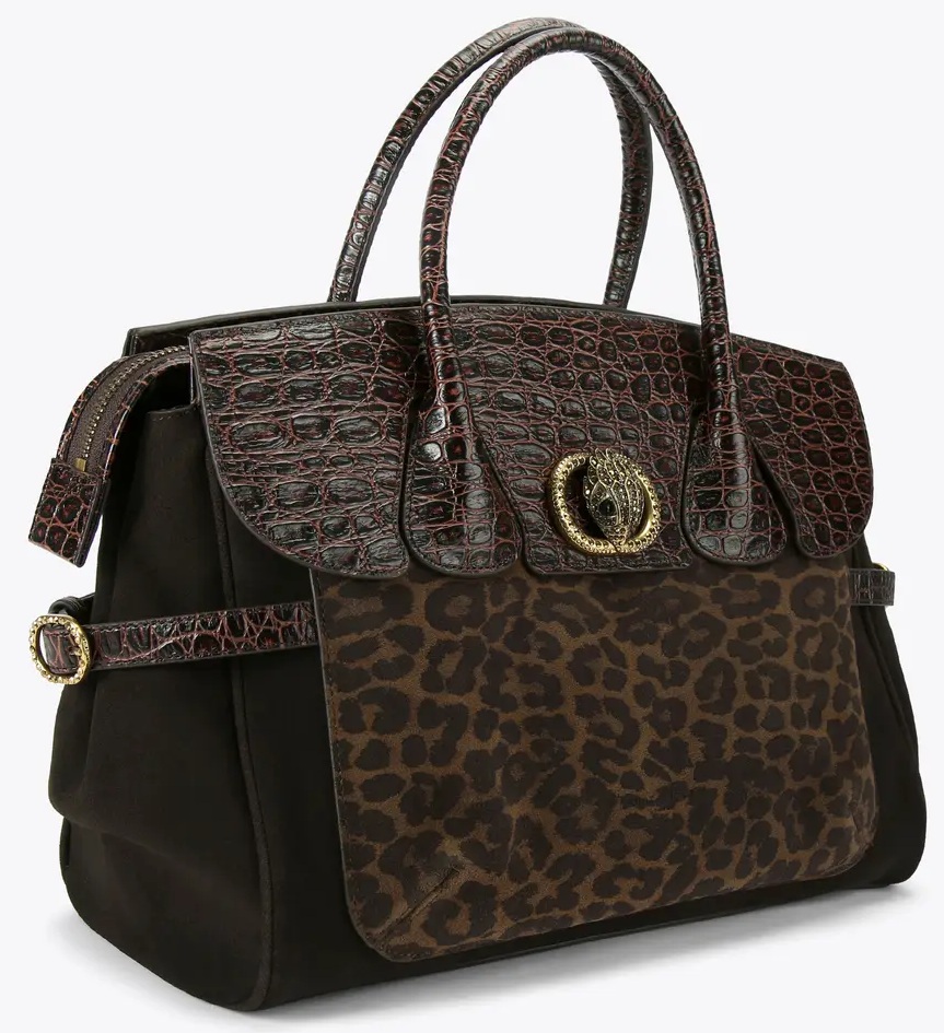 This chic Kurt Geiger women's handbag combines luxury and character in a single stylish design. Crafted from dark brown suede with a leopard-print front panel, the bag is finished with a flap and handles in a glossy crocodile pattern. The combination of animal print and crocodile look creates a powerful and fashionable look. The bag closes with a flap featuring a gold-colored Kurt Geiger emblem with a crown and offers ample space for everyday use. Perfect for those who appreciate classic elegance with a rugged edge. Dimensions: 27cm (H), 36cm (L), 16cm (D)