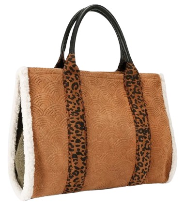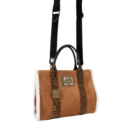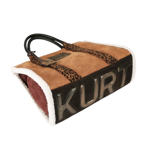 This Kurt Geiger women's bag is a real eye-catcher for fall and winter. The bag features a warm camel brown color with a wavy pattern and is finished with cream-colored faux fur along the edges. The handles and stripes are covered in a bold leopard print, creating a trendy and eye-catching look. A green metallic Kurt Geiger logo adorns the front, and a label with the famous rainbow eagle logo hangs from the handle. The bag is spacious and practical, perfect for everyday use.