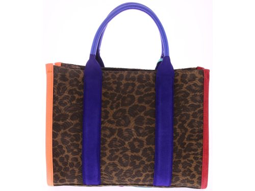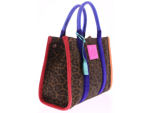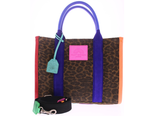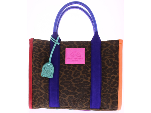Make a style statement with this women's Kurt Geiger shopper bag, featuring a leopard print. The bag combines a dark brown base with colorful accents in deep purple, bright red, and orange. The eye-catching leather Kurt Geiger logo is placed centrally on a contrasting pink panel. This spacious and sturdy shopper is perfect for everyday use, from work to a day out. The contrasting colors and animal print design create a modern and luxurious look. Thanks to the comfortable handles and practical size, the bag offers both style and functionality.