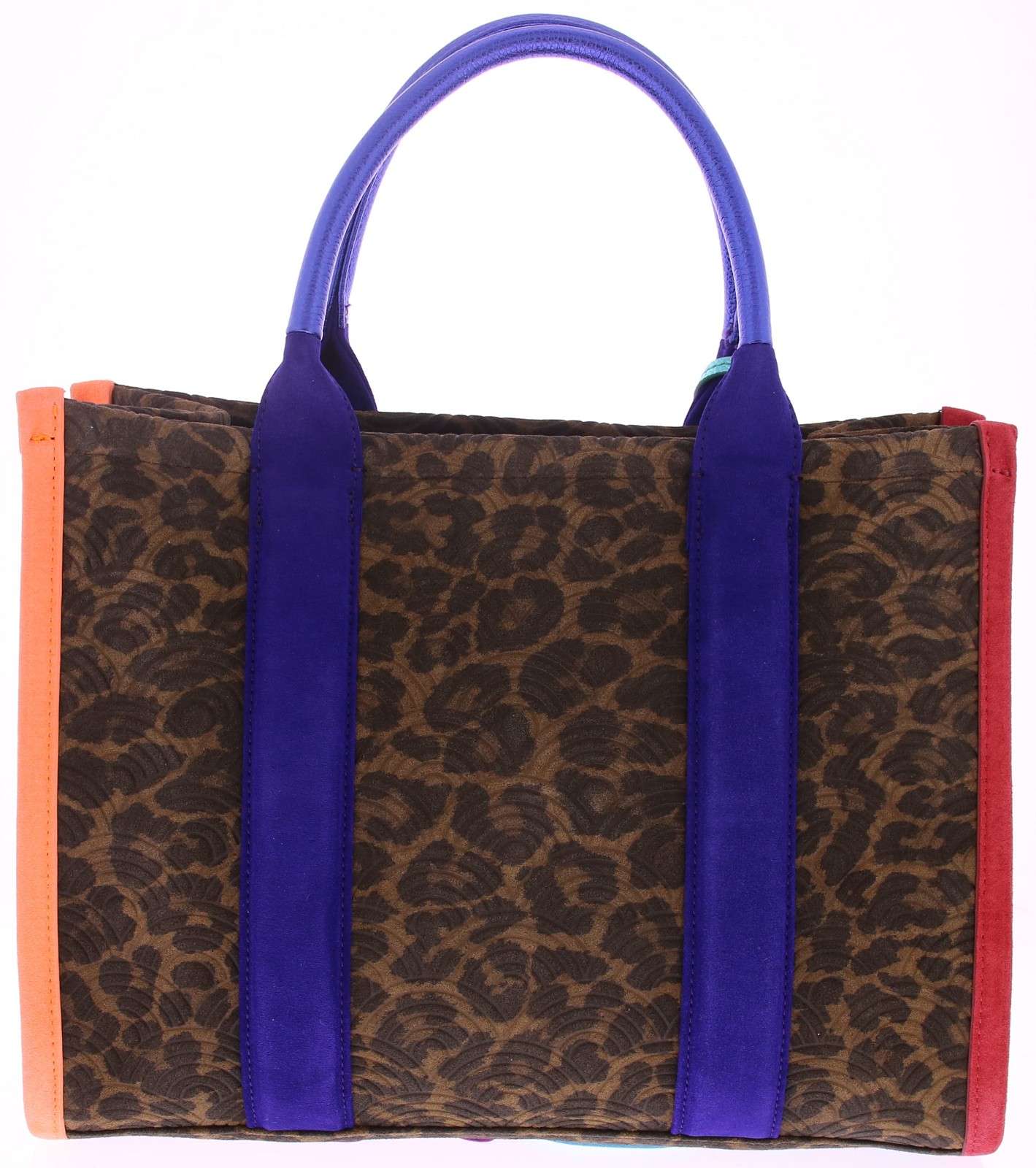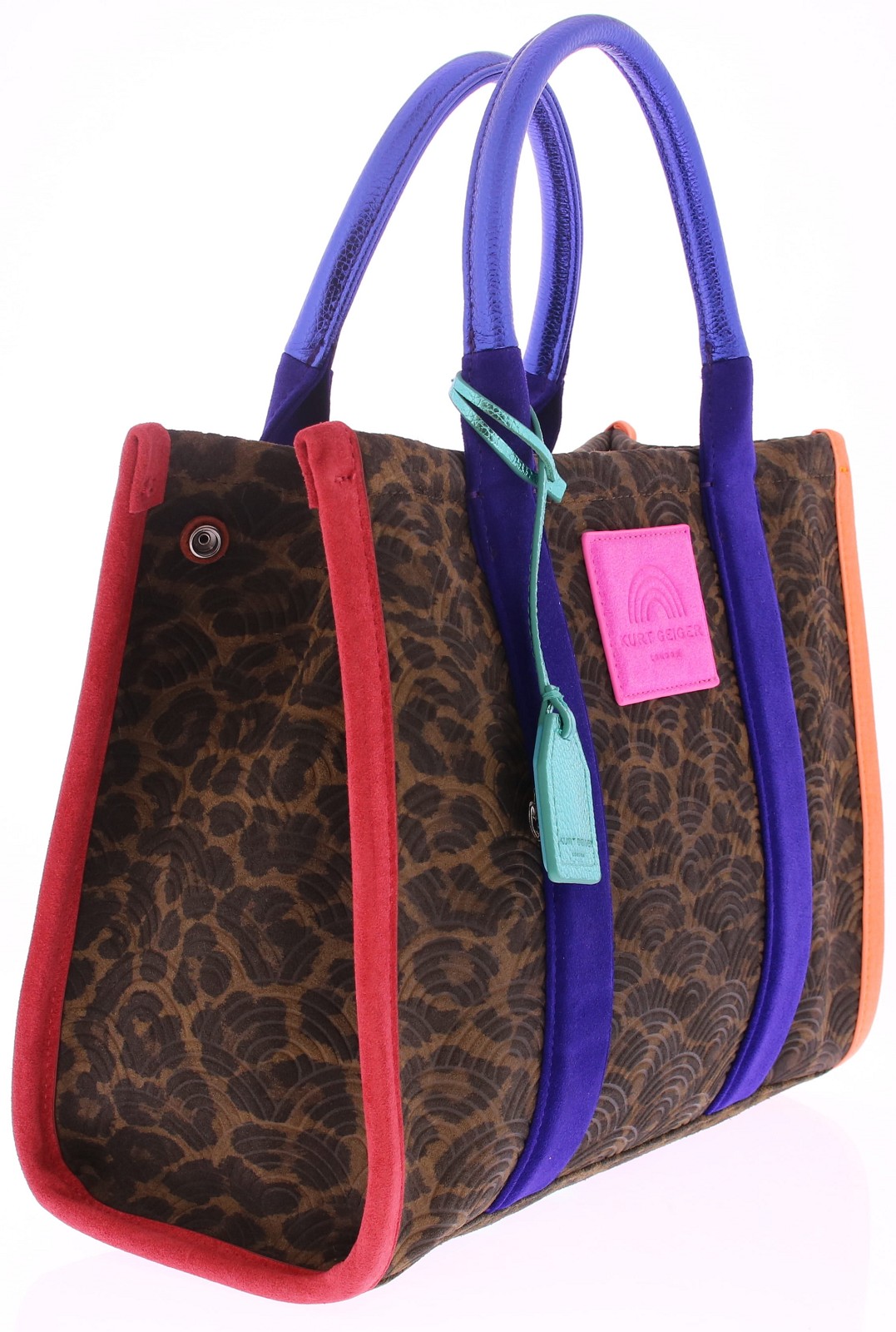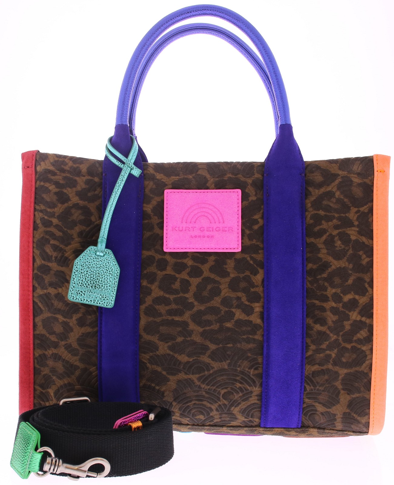 Make a style statement with this women's Kurt Geiger shopper bag, featuring a leopard print. The bag combines a dark brown base with colorful accents in deep purple, bright red, and orange. The eye-catching leather Kurt Geiger logo is placed centrally on a contrasting pink panel. This spacious and sturdy shopper is perfect for everyday use, from work to a day out. The contrasting colors and animal print design create a modern and luxurious look. Thanks to the comfortable handles and practical size, the bag offers both style and functionality.