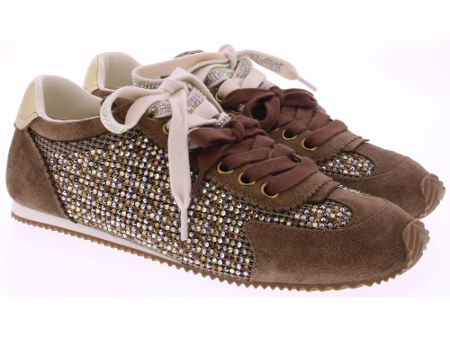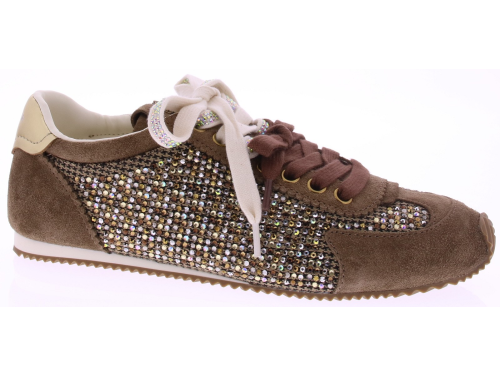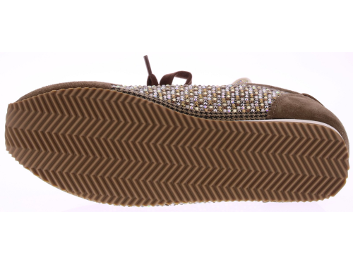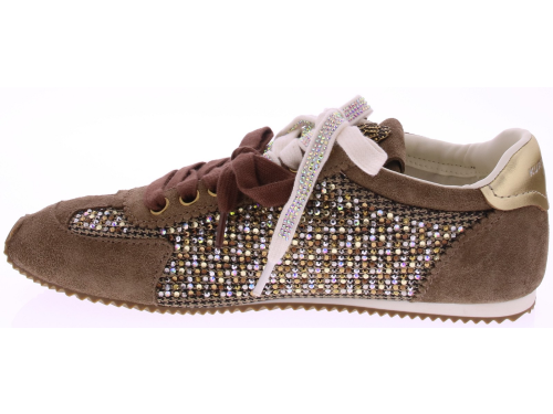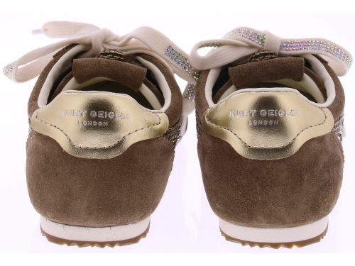 Mid-brown suede women's sneakers from Kurt Geiger, model Islington. These sneakers feature a combination of suede and a mottled fabric, giving them a luxurious and striking look. The gold-colored details and the iconic Kurt Geiger logo on the tongue complete the stylish look. A fashionable sneaker that instantly adds a touch of sparkle to any casual look. Discover other Kurt Geiger women's sneakers at Klijsen.