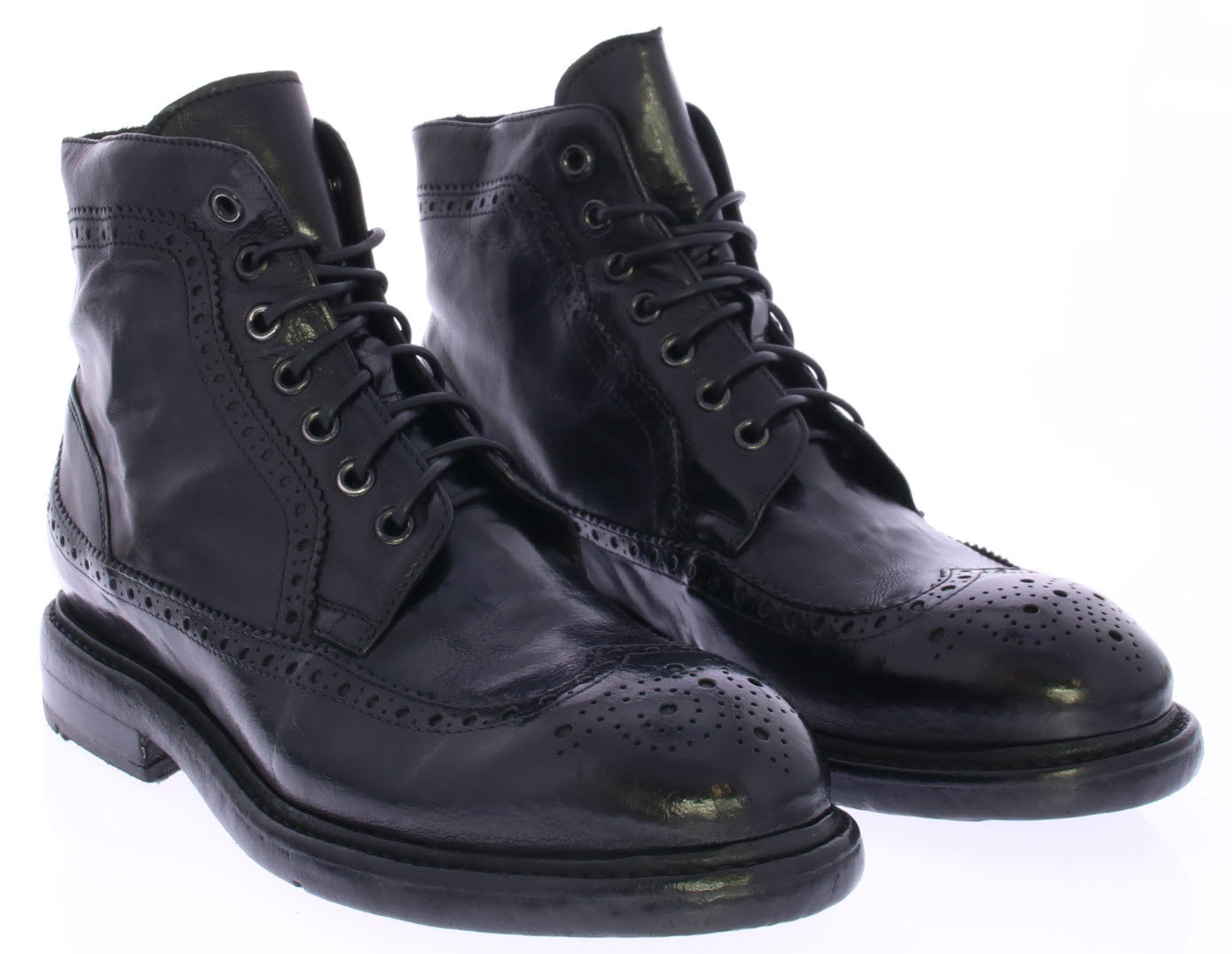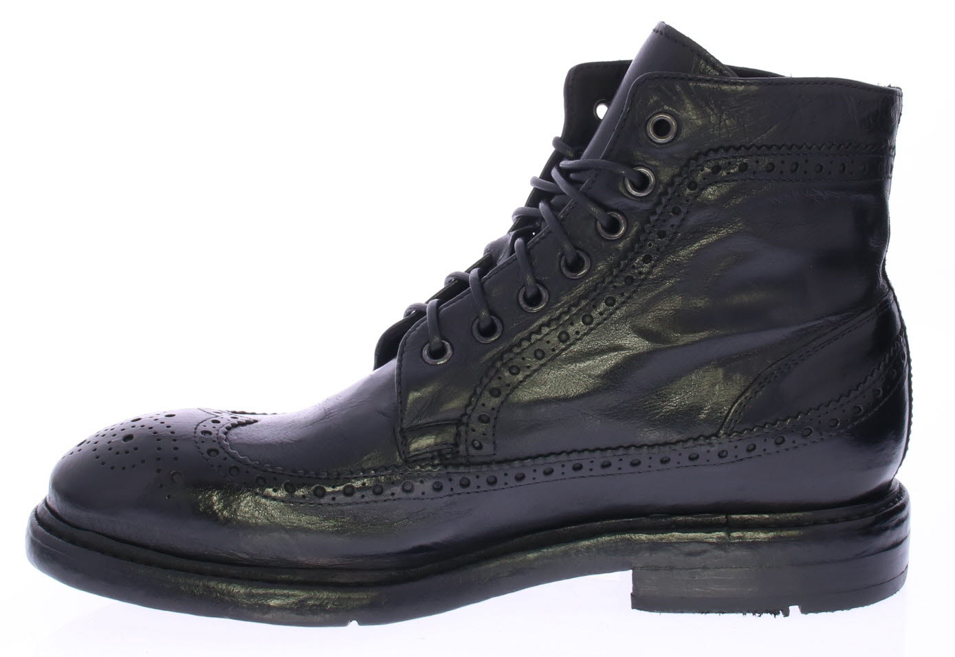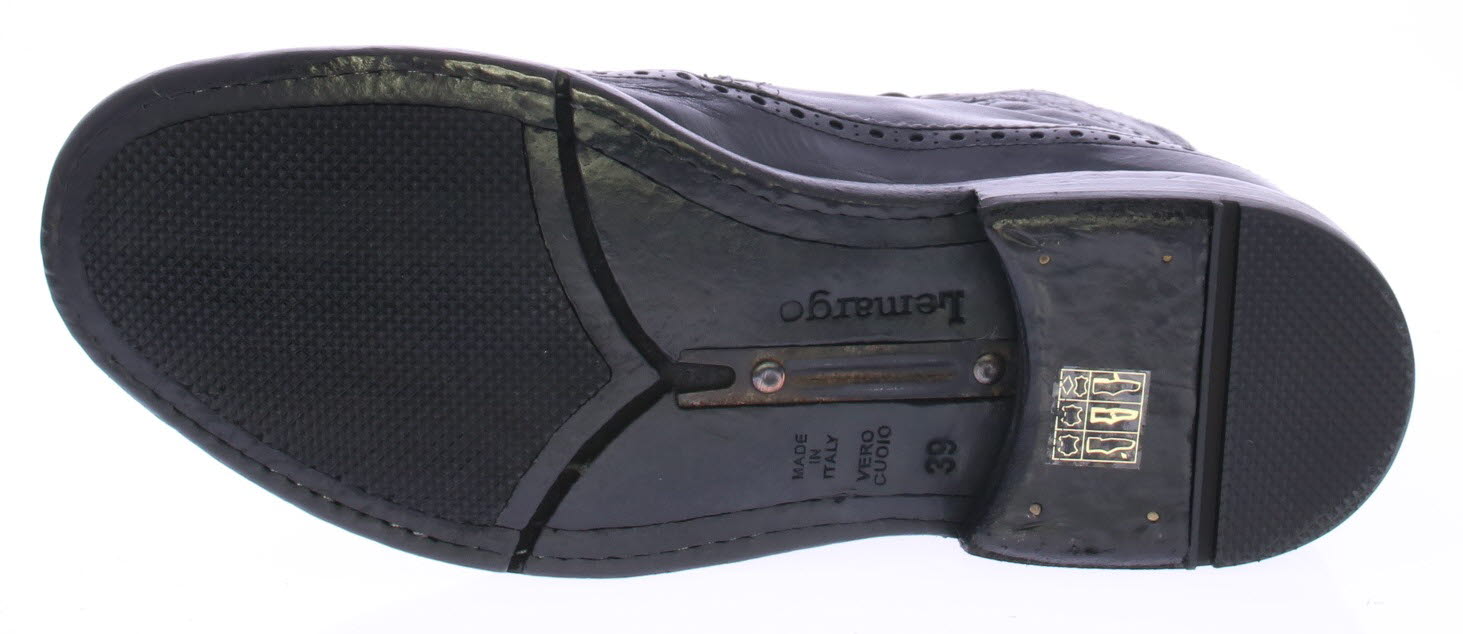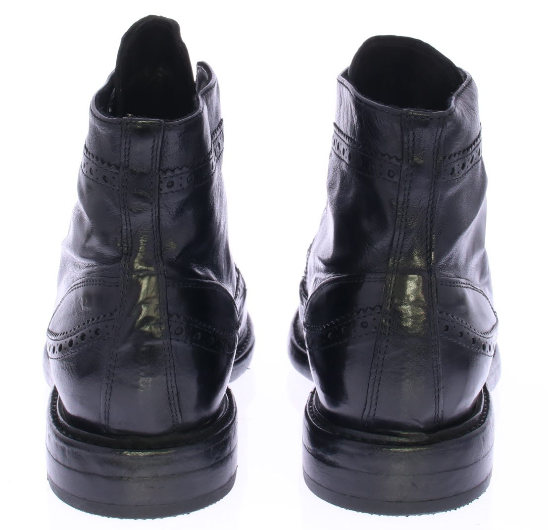 Black leather men's ankle boot from Lemargo. The shoe has a brogue pattern. The shoe is made of washed buffalo leather with a vintage look. The leather has become very supple due to the washing. The shoe is colored by immersing the entire shoe in the tanner's dye bath, so that the lining, sole and upper all get the same color tone. The shoe has a leather sole with rubber insert.