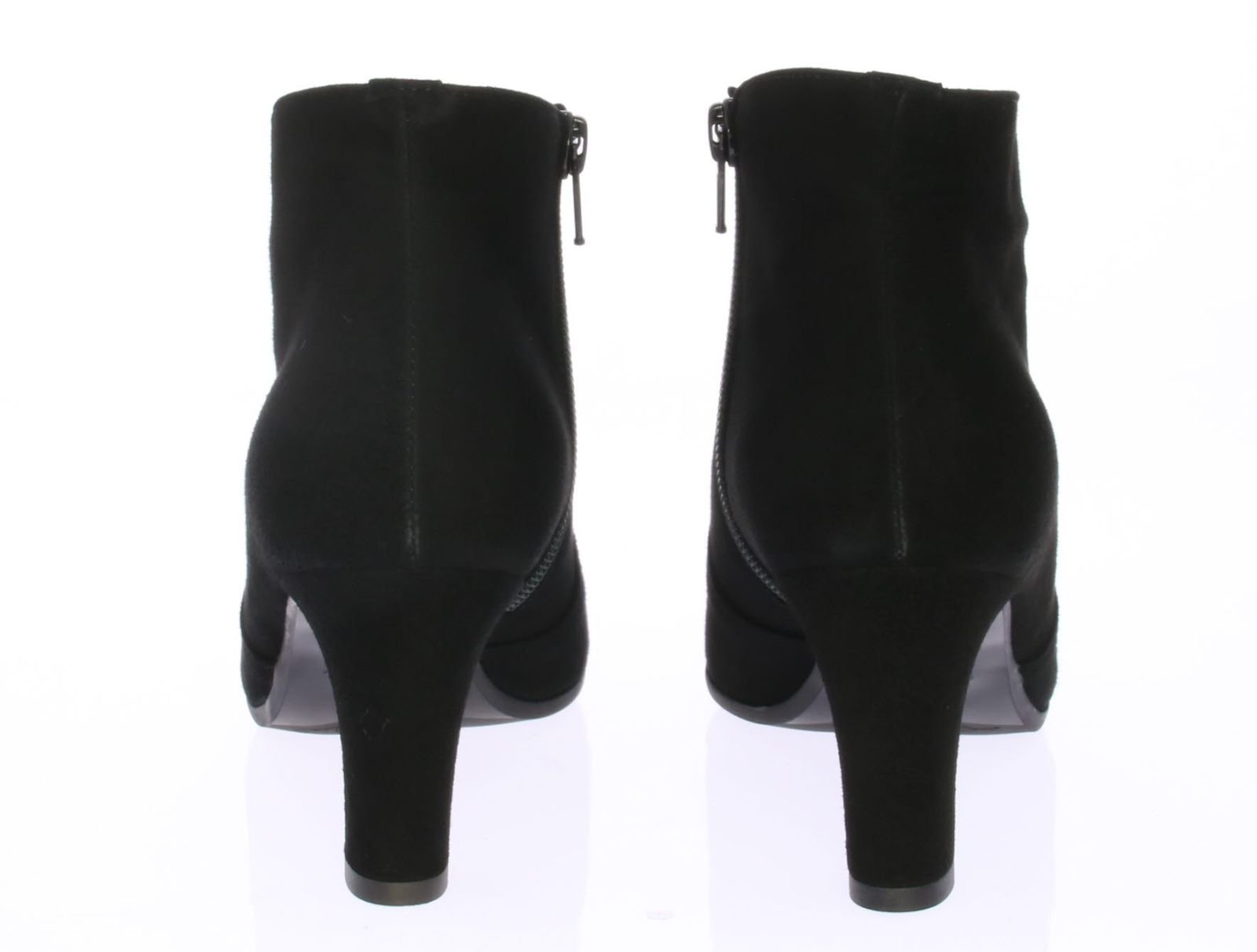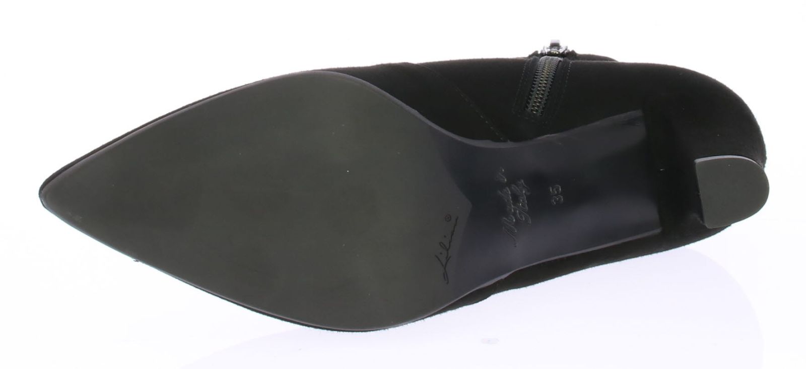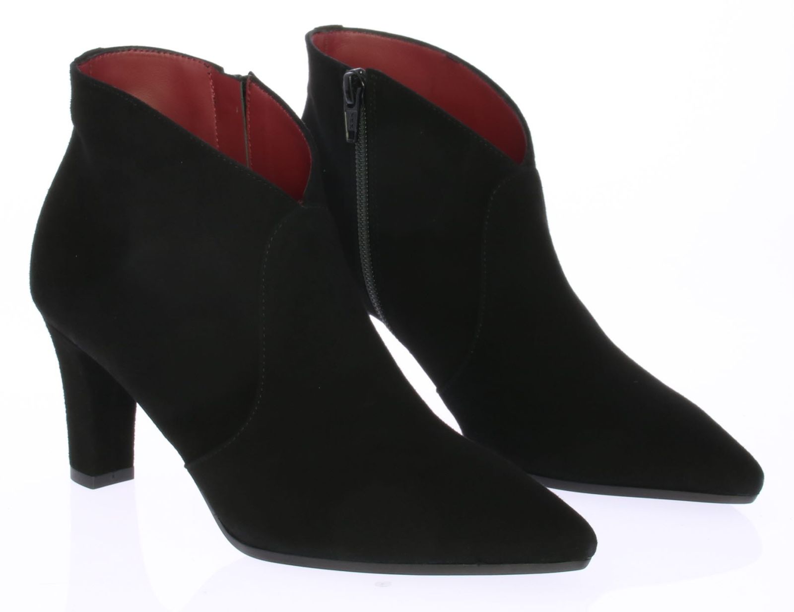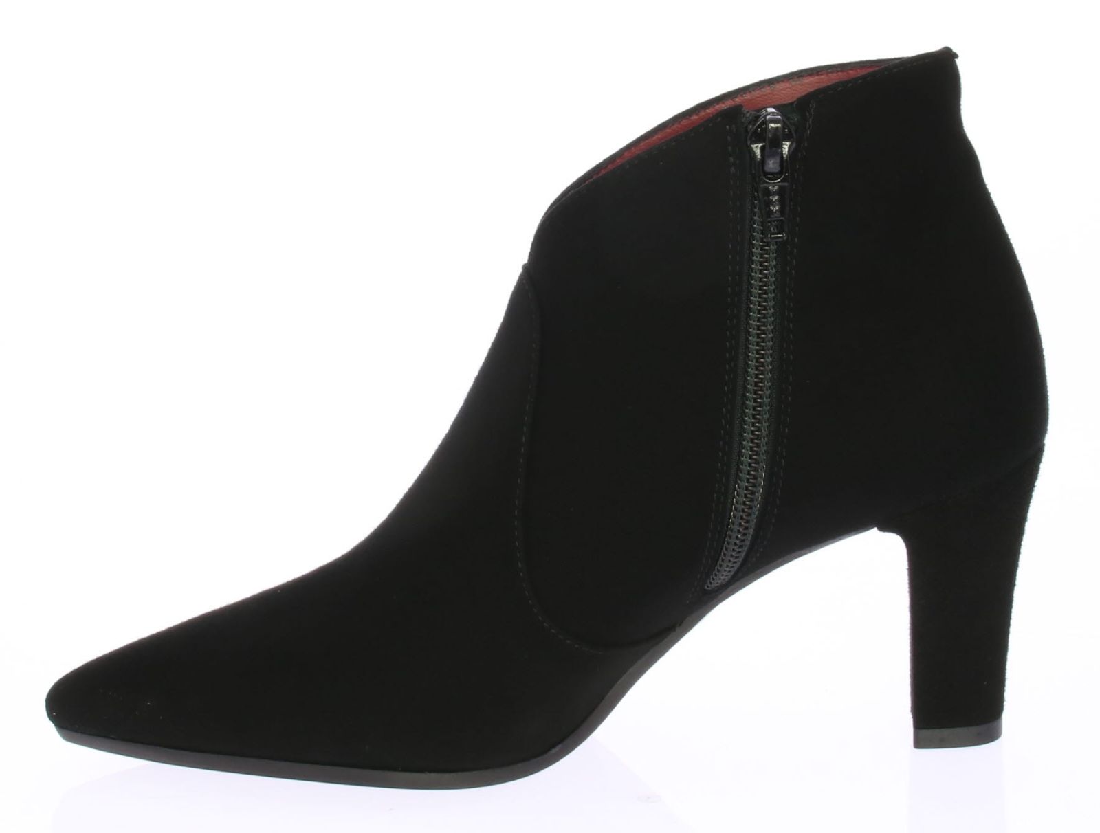 Black suede women's ankle boots by Lillian. The boot has a V-cutout on the instep for a very feminine effect and is equipped with a narrow heel. Due to the pointed last and slim cutout, the boot is very suitable to wear with dresses or skirts.