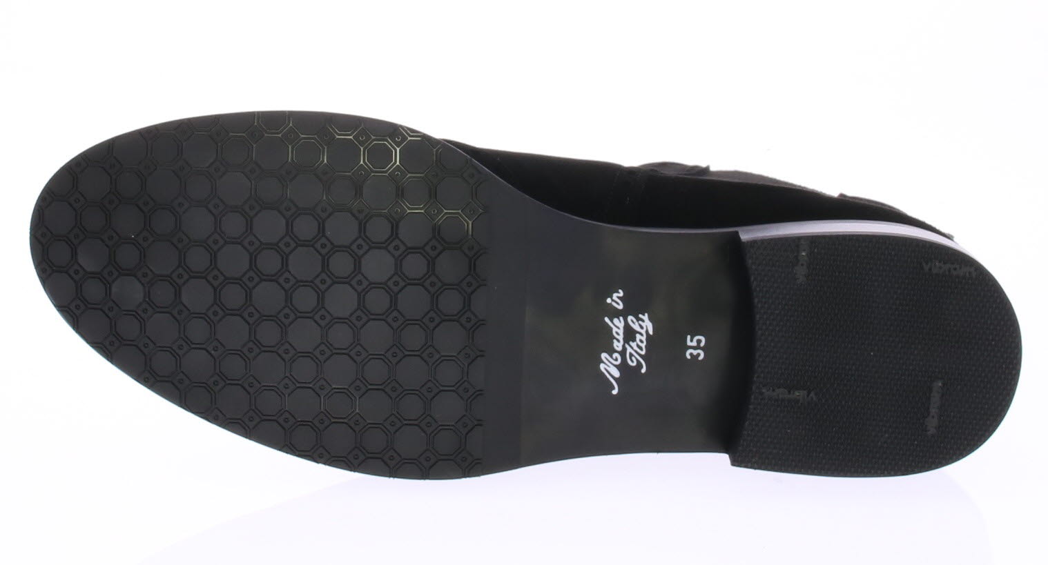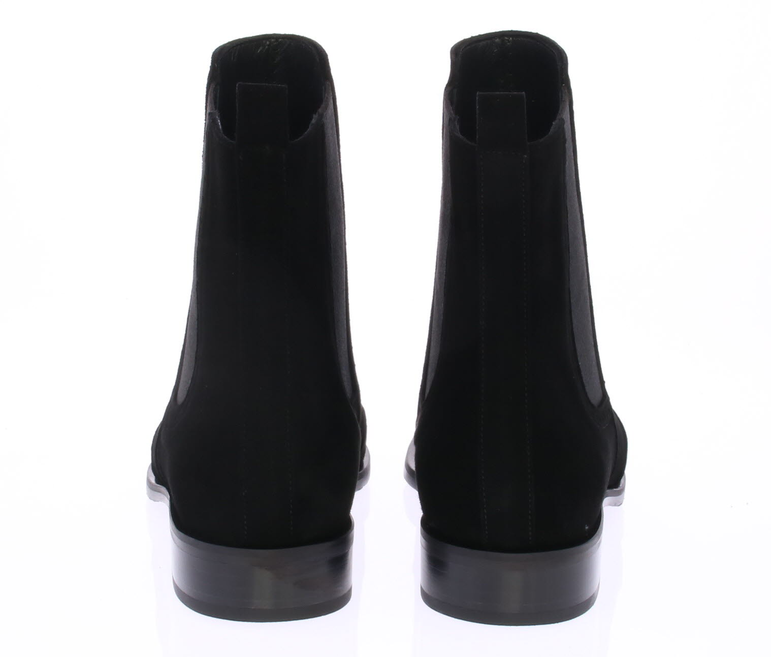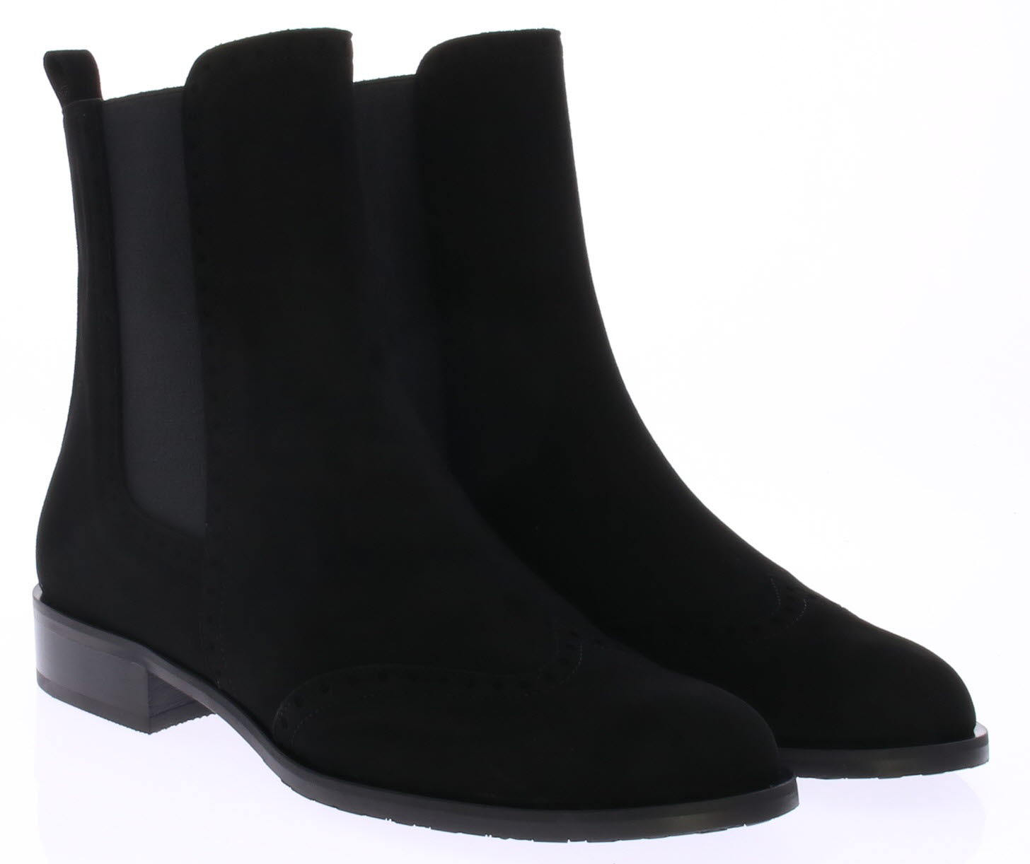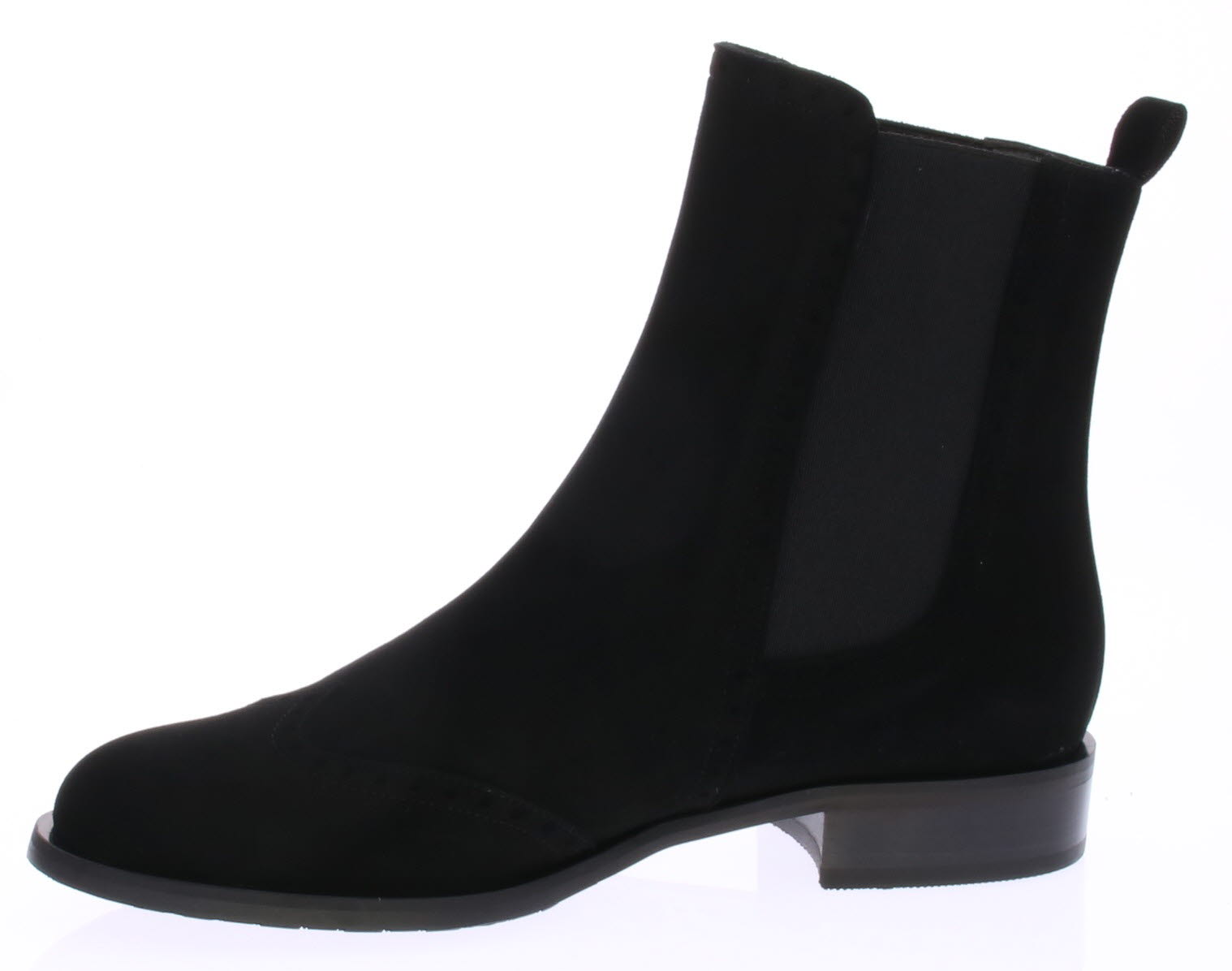 Black suede ladies chelsea boot by Lilian. The boot has a subtle decorative stitching on the nose. The sole is made of rubber.