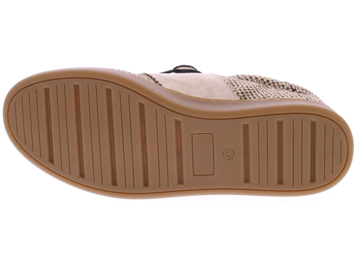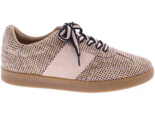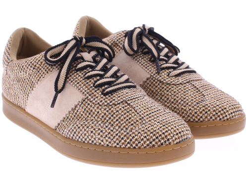 Beige fabric women's sneaker from Lisa&Jo. This sneaker features a fabric upper with small, shiny studs. The two-tone laces add an extra touch, while the low-cut honey-colored sole provides a sporty look and exceptional comfort.