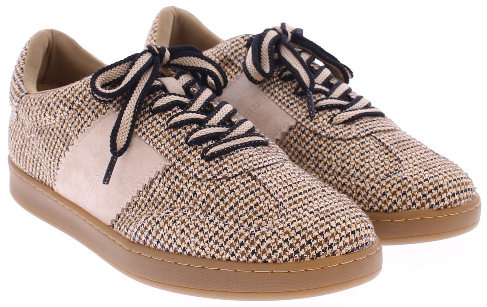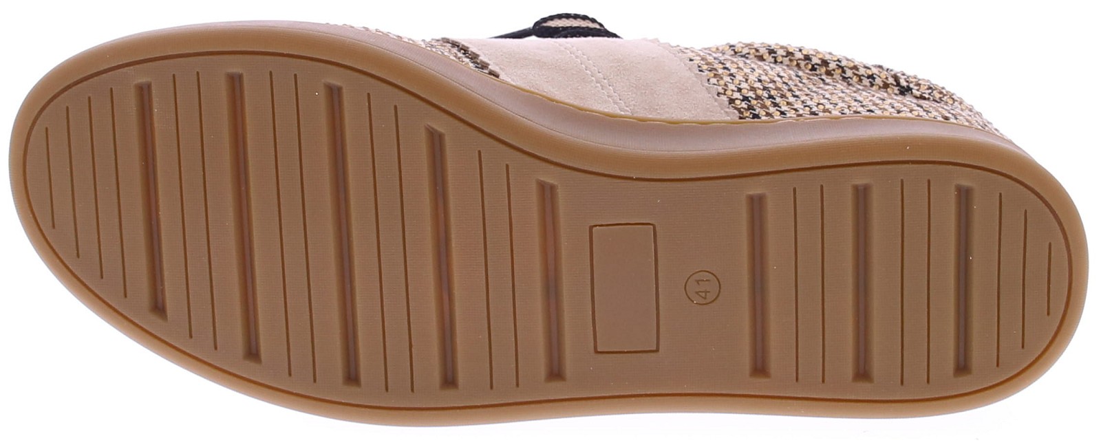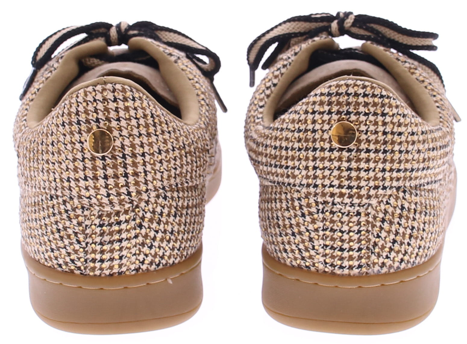 Beige fabric women's sneaker from Lisa&Jo. This sneaker features a fabric upper with small, shiny studs. The two-tone laces add an extra touch, while the low-cut honey-colored sole provides a sporty look and exceptional comfort.