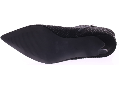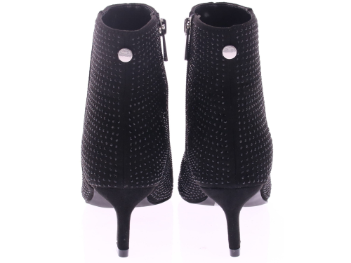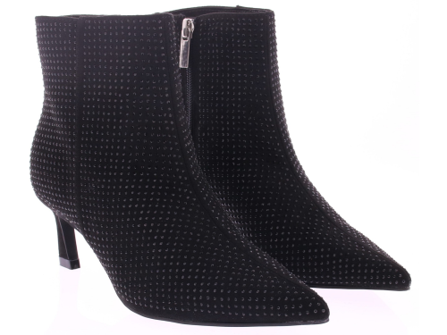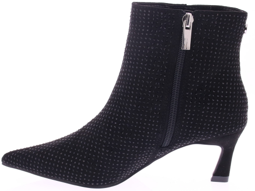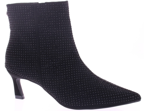 Black fabric women's short boot from Lisa & Jo. This Yassira boot has a fabric upper with small, shiny studs. The covered heel is 6 cm high. The lining is leather.