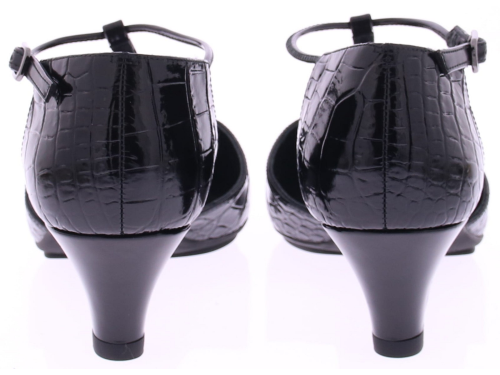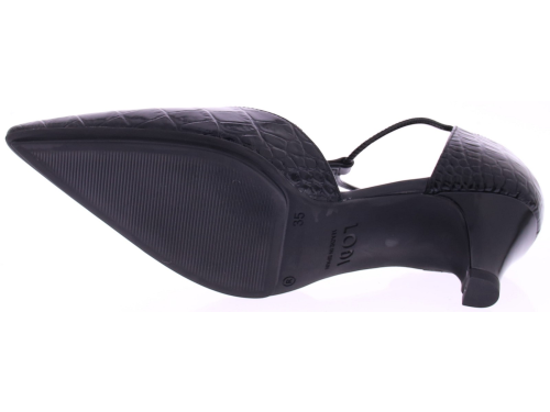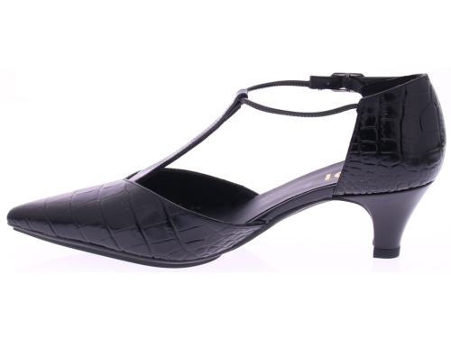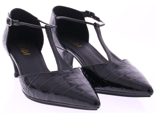 Black leather women's pumps with a print from Lodi. These black leather pumps from Lodi exude pure class. The refined crocodile embossing gives the shoe a subtle, luxurious twist, while the elegant T-strap with a silver buckle adds a feminine and stylish touch. The mid-high 5cm heel offers just the right balance of comfort and elegance, making these pumps easy to wear all day or night. Whether you're heading to the office or attending a formal event, these pumps will always add a touch of sophistication to your outfit.