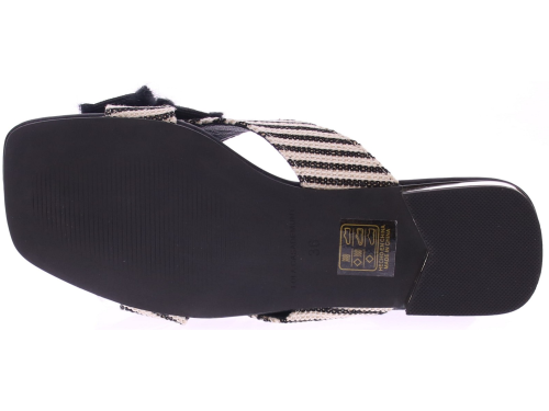 Black and white fabric women's slippers from Lola Casademunt. These slippers feature a black and white striped strap with a decorative trim on the instep. The open design is easy to slip on and perfect for warm days. The flat sole ensures a comfortable fit. Pair them with a summer dress, skirt, or airy pants. Discover other women's mules from Lola Casademunt at Klijsen.