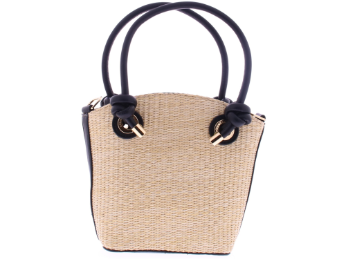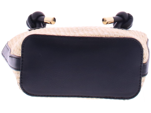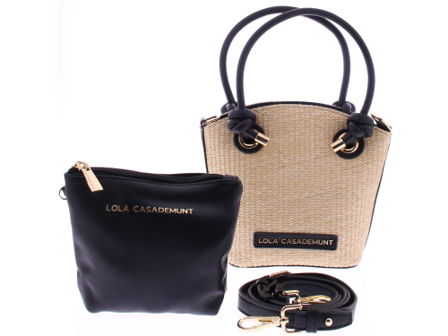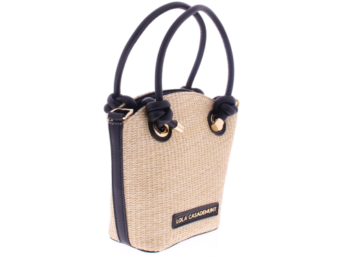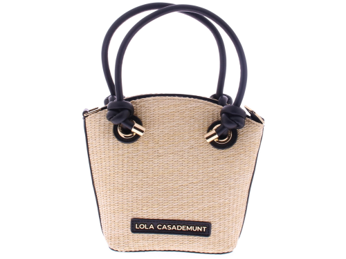 Beige PU leather women's bag with a raffia effect from Lola Casademunt. This summery bag has a woven look and features black handles with knot detailing and gold-colored accents. The logo on the front gives it a distinctive look. Lightweight and spacious enough for your daily essentials, it pairs beautifully with a summer outfit or beach look. Discover other women's accessories from Lola Casademunt at Klijsen.