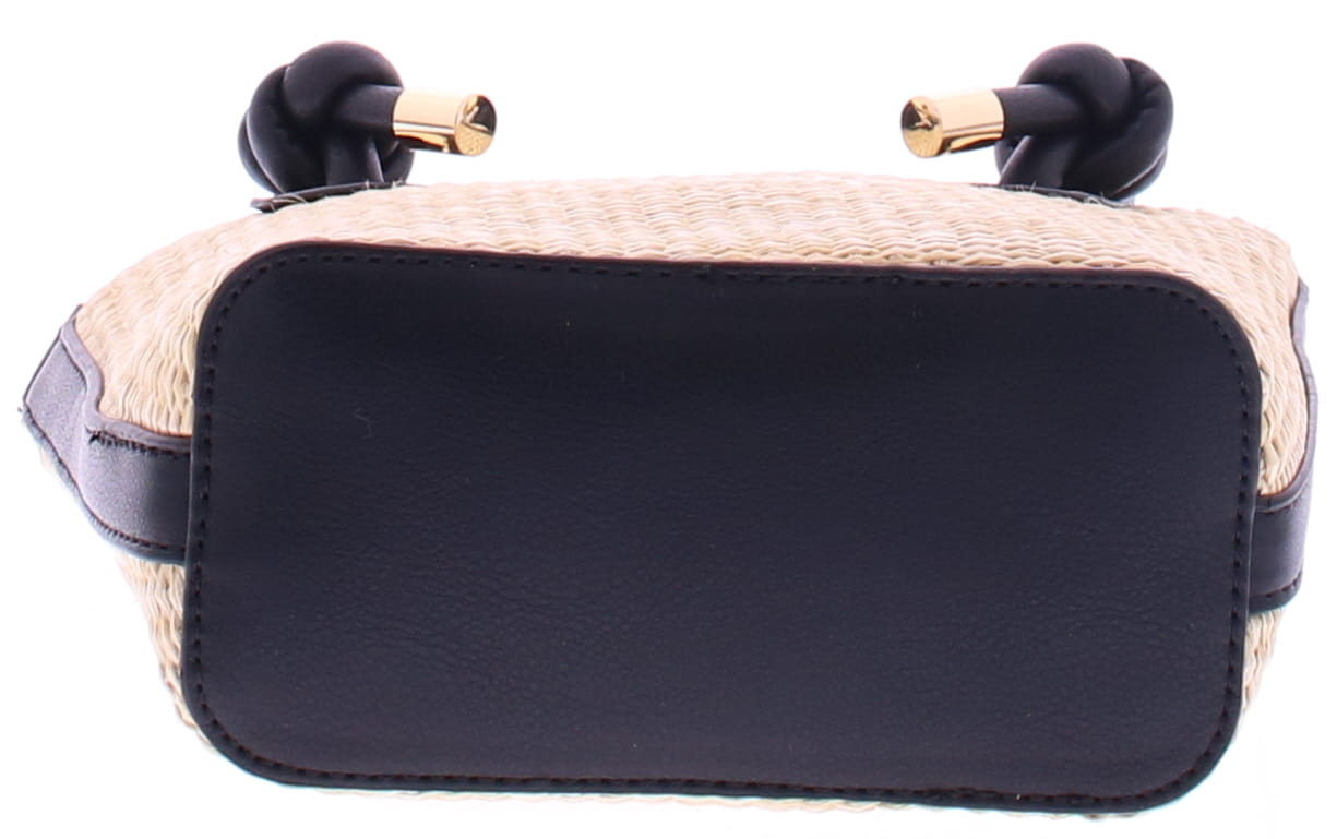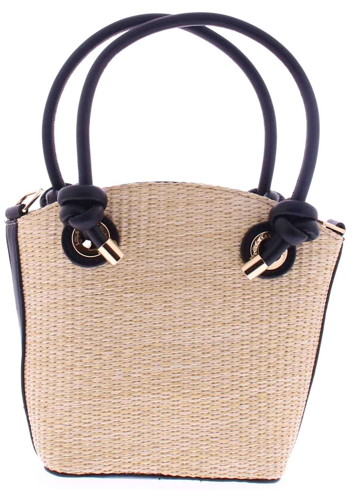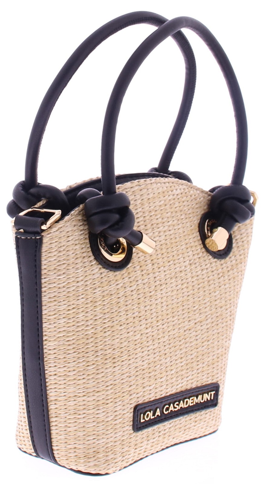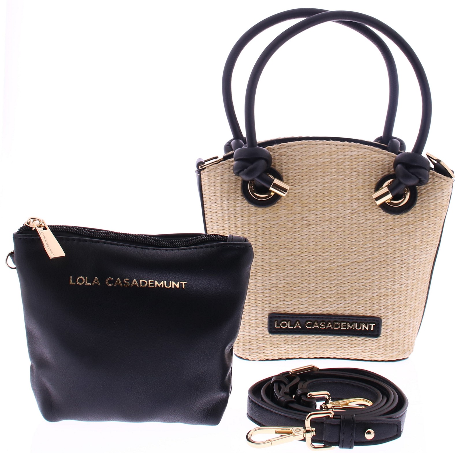 Beige PU leather women's bag with a raffia effect from Lola Casademunt. This summery bag has a woven look and features black handles with knot detailing and gold-colored accents. The logo on the front gives it a distinctive look. Lightweight and spacious enough for your daily essentials, it pairs beautifully with a summer outfit or beach look. Discover other women's accessories from Lola Casademunt at Klijsen.