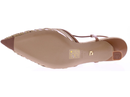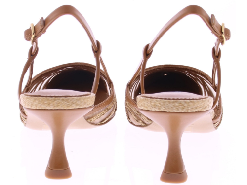 Cognac raffia leather women's slingback pump from Lola Cruz. Model 108Z69BK. This pump is crafted from a combination of natural raffia straps on fine mesh, finished with cognac-colored leather. The 5 cm heel is slightly flared for stability. The adjustable heel strap ensures a snug fit. Perfect with a dress or skirt, but also looks great with summer pants. Discover other women's pumps from Lola Cruz at Klijsen.