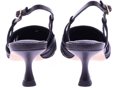 Black raffia leather women's slingback pump by Lola Cruz. Model 108Z69BK. This pump is made from a material combination with natural raffia straps on fine mesh, finished with cognac-colored leather. The heel is 5 cm high and flares slightly for a stable stance. The adjustable heel strap ensures the shoe fits snugly around the foot. Comfortable to wear with a dress or skirt, but also looks great with summer trousers. Discover other women's pumps by Lola Cruz at Klijsen as well.