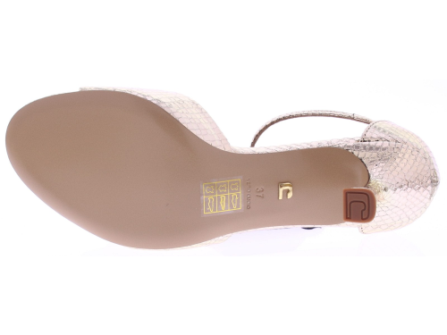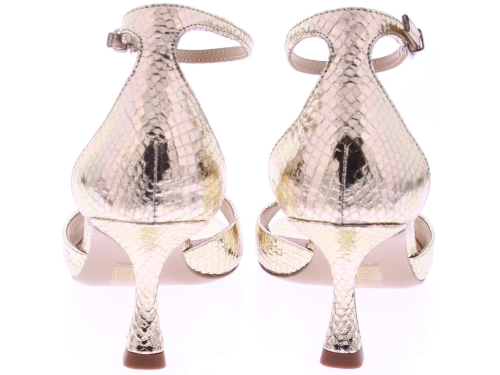 Gold-colored leather women's sandal from Lola Cruz. This sandal is crafted from leather with a piton print and has a 6 cm heel. The closed heel and adjustable ankle strap ensure a snug fit. The open toe gives it a summery look, and the leather footbed is comfortable to wear. Pair it beautifully with a dress or skirt for a festive or summery look. Discover other women's shoes from Lola Cruz at Klijsen.