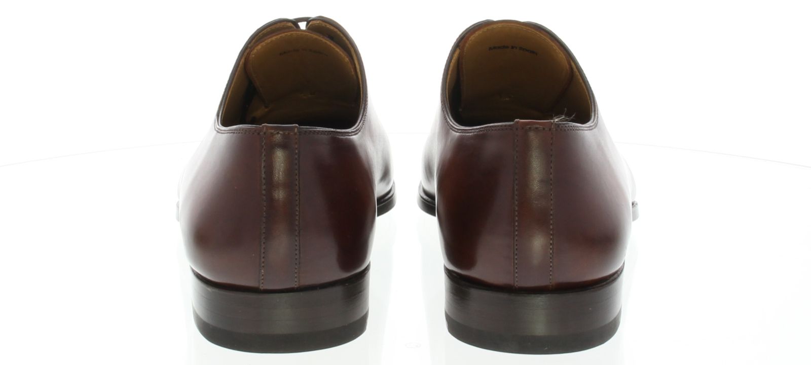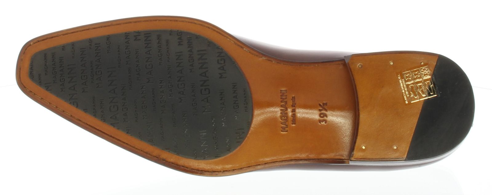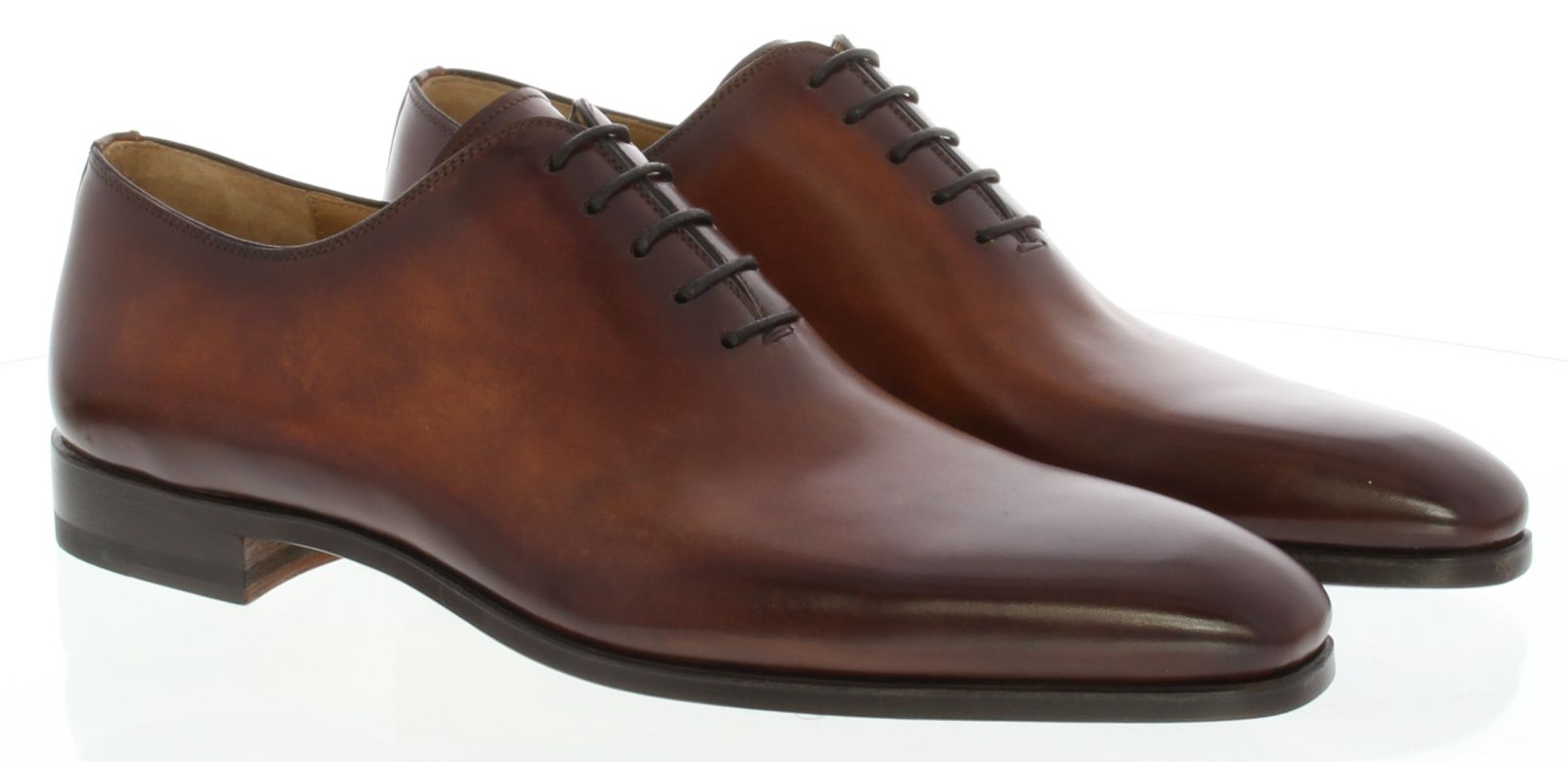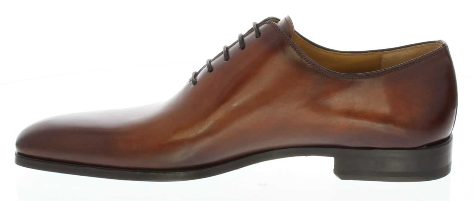 Brown leather men's lace-up shoe by Magnanni. Made entirely from 1 piece of leather. The shoe has a leather sole with rubber insert and is fully leather lined. The finish is applied by hand and this gives the shoe a beautiful color variation.