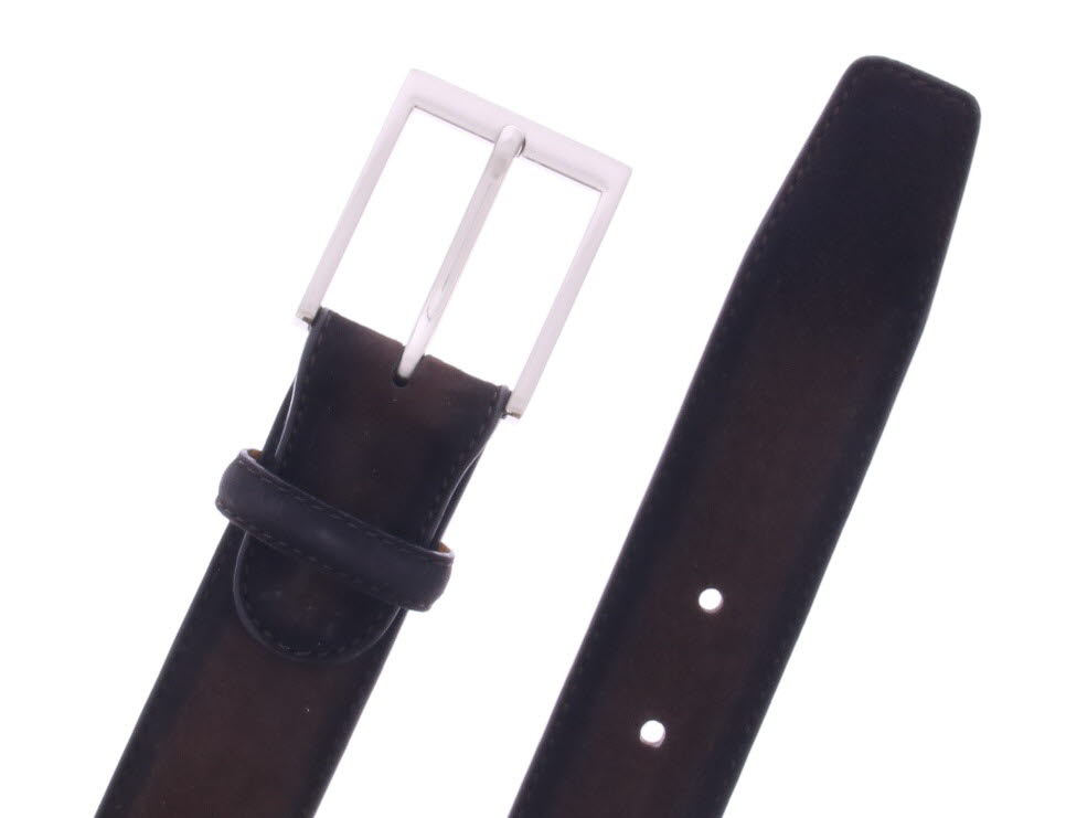 Dark brown goat suede men's belt by Magnanni. The belt is darker towards the seams. The lining is leather and the belt can be shortened on the buckle side.