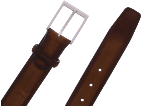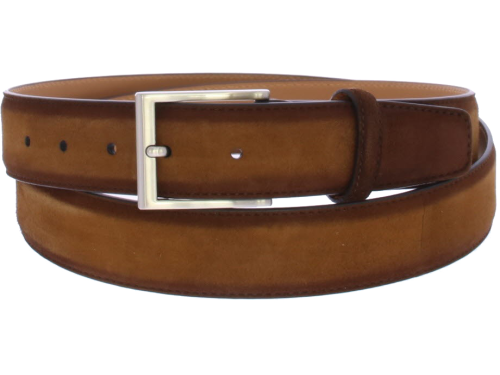 Men's belt by Magnanni in cognac suede. The belt can be shortened at the buckle side.