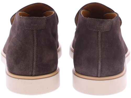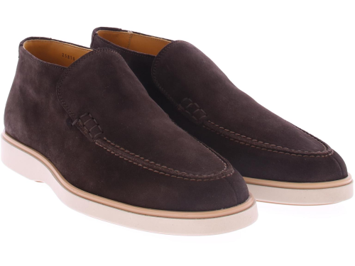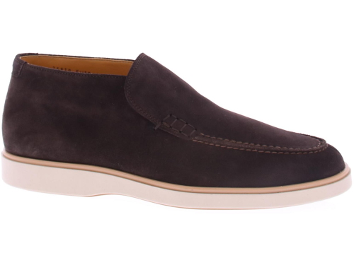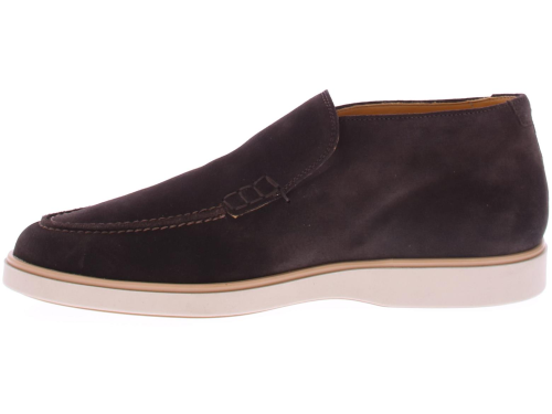 Men's mid-height loafer in dark brown suede with leather lining on a sporty rubber sole. The interior has a leather lining with a fixed footbed with comfortable cushioning due to the soft foam layer. The exceptionally flexible rubber cup sole gives this model its sporty look and is reinforcing. You can easily put on this model thanks to the elastic inserts under the tongue.