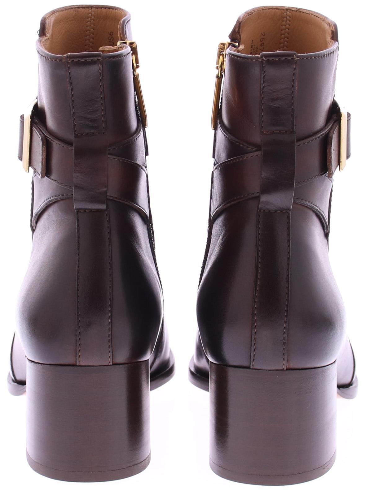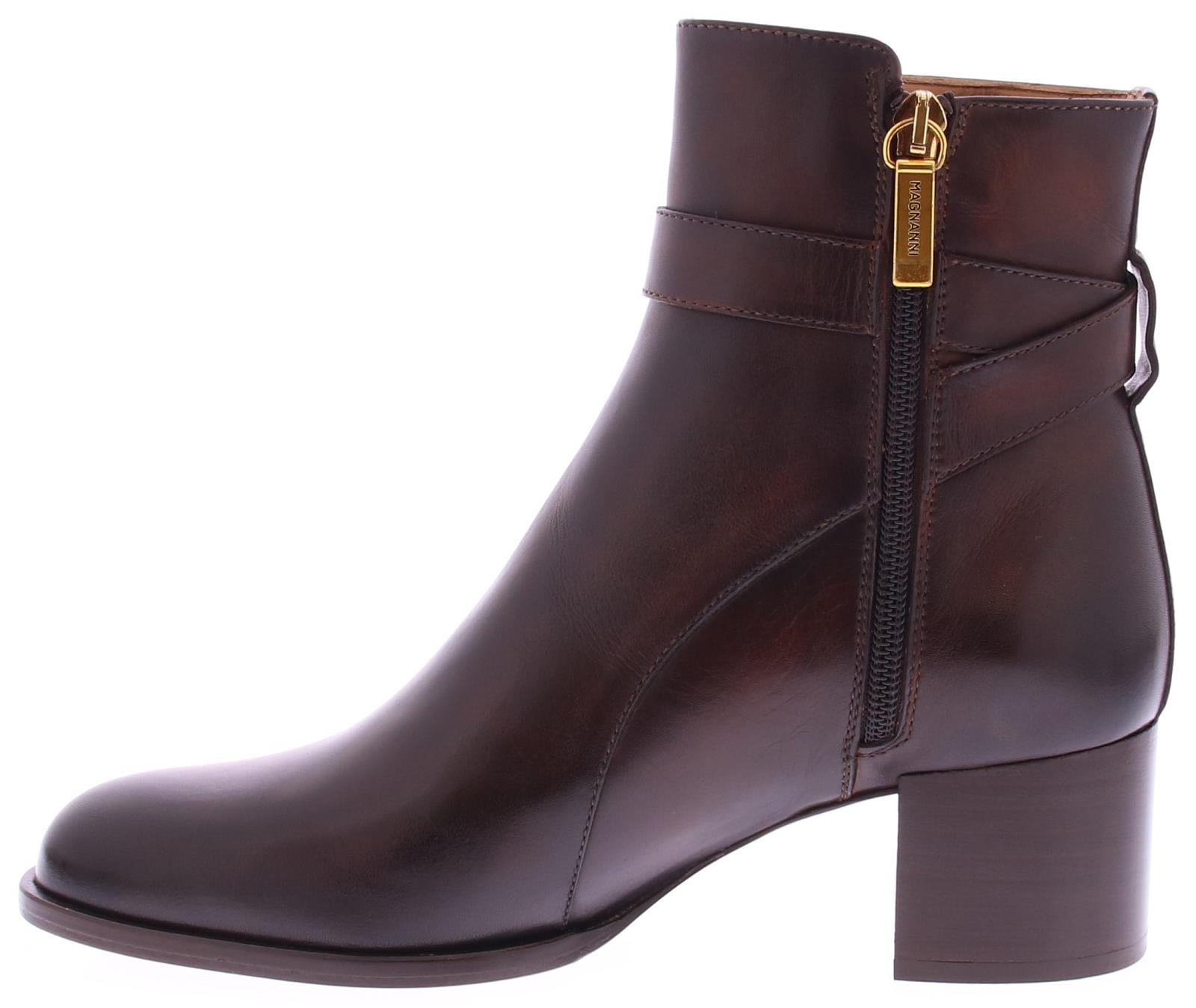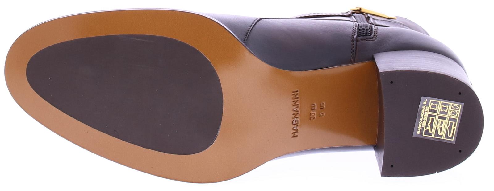 Elegant dark brown short leather women's boot by Magnanni. The boot has a zipper on the inside for easy entry, a block heel with a heel height of approximately 5 cm and a leather outsole with rubber insert.