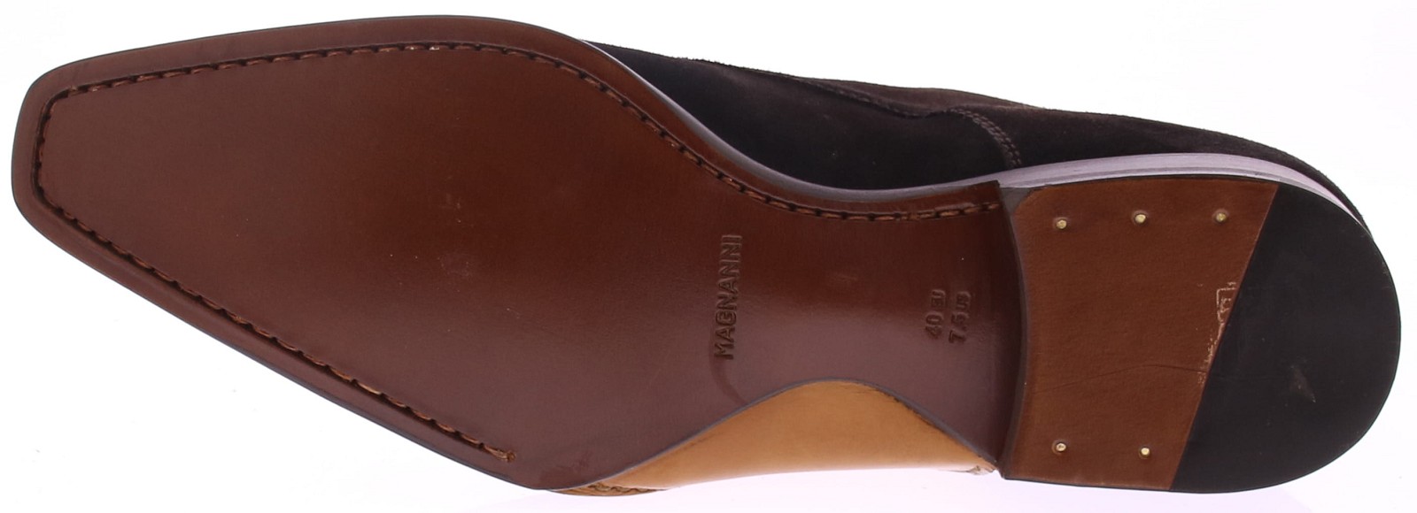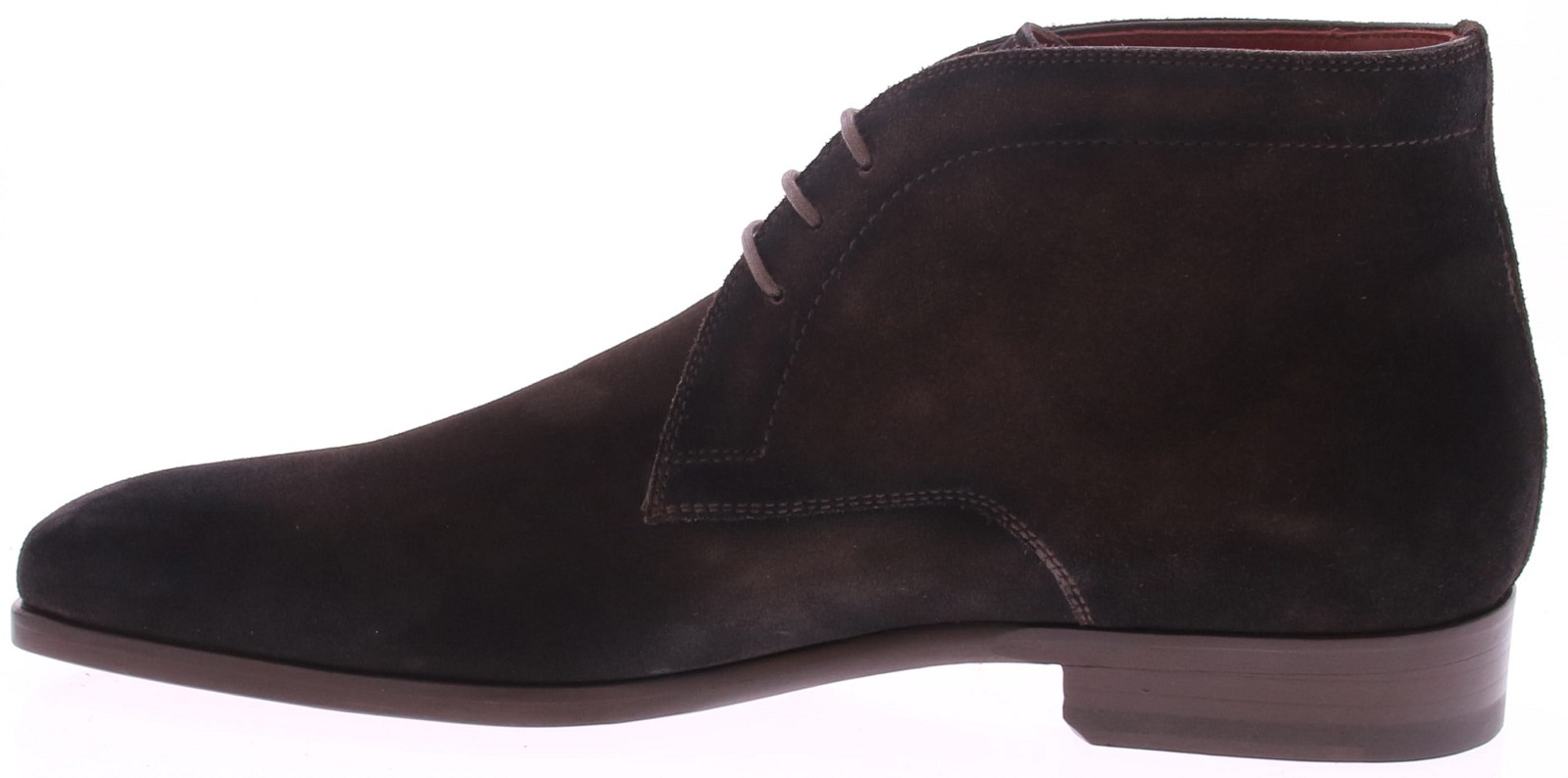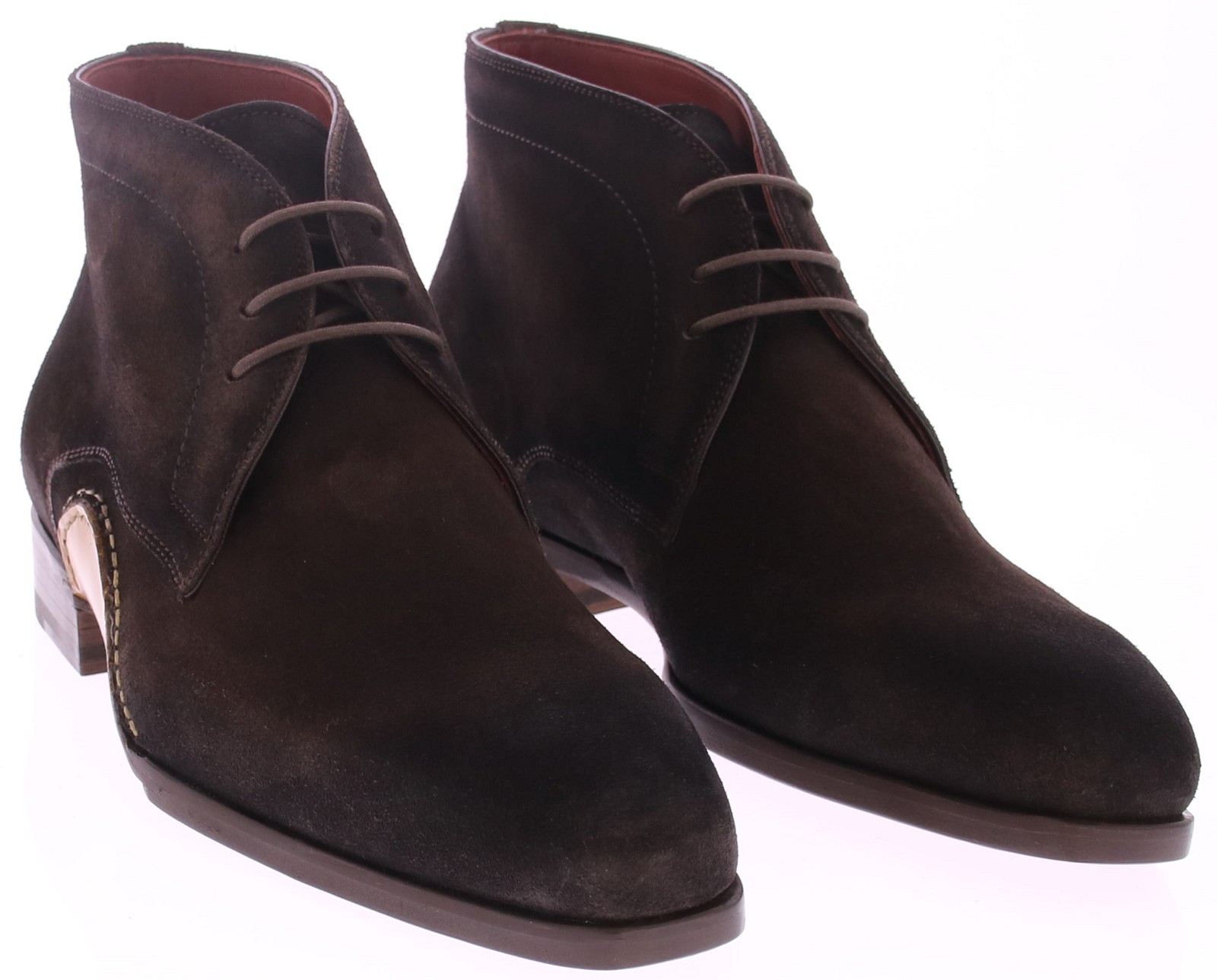 This elegant chukka boot from Magnanni, crafted from deep dark brown suede, exudes understated luxury. The style features an Opanka sole construction, with the upper attached to the sole with visible hand stitching. This traditional construction method provides extra flexibility and a handcrafted look. The soft suede conforms effortlessly to the foot, while the slim fit and fine finish make the shoe perfect for both business and casual occasions.