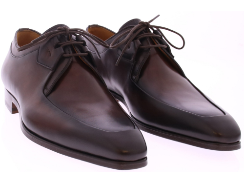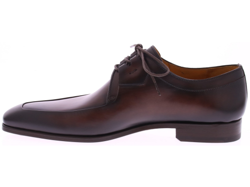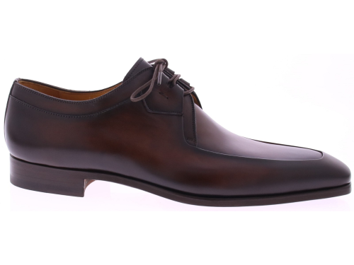 This refined Magnanni lace-up shoe in Wind Marron is a textbook example of craftsmanship and style. The shiny "mirror blade" on the toe enhances the shoe's luxurious character, while the unique loop lacing adds a subtle twist to the classic derby style. Details that make all the difference: The hand-polished patina in Wind Marron creates a deep, warm shade of brown with a subtle sheen. The loop lacing adds a modern touch without compromising the classic lines of the design. Perfect for: Formal occasions, weddings, business attire, or for the connoisseur who appreciates subtle details and top quality. Style tip: Wear with a dark brown or navy suit for a rich, tonal look, or pair with elegant chinos and a blazer for a stylish smart-casual look.