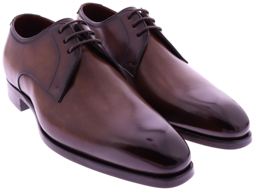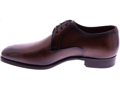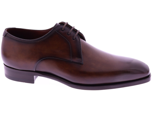 Medium brown leather men's lace-up shoe by Magnanni. This luxury model in the color Wind Leeds Tabacco comes from Magnanni's exclusive Selection line and is crafted from high-quality, hand-patinated leather. The refined lines and artisanal finish emphasize the elegant character of this shoe. The full leather sole and lining ensure optimal breathability and exceptionally high wearing comfort. A timeless choice for the modern gentleman who appreciates craftsmanship and class.
