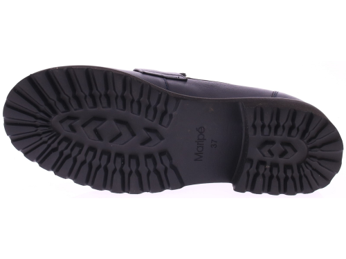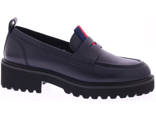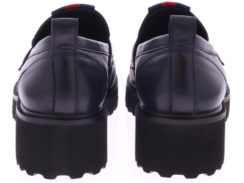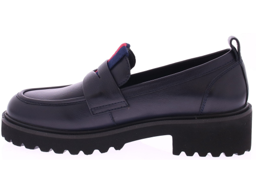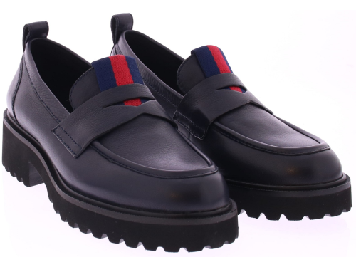Dark blue leather slip-on for women from Maripe. This shoe features a strap across the instep with a small blue/red fabric ribbon. The lightweight, chunky sole provides a modern look and extra comfort. The perfect combination of fashion, comfort, and quality – this Maripe women's slip-on effortlessly complements any outfit.