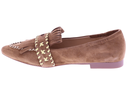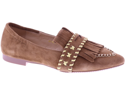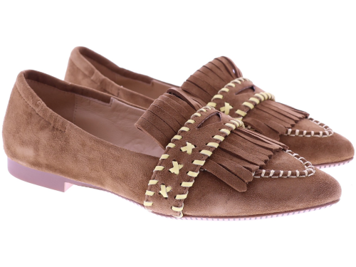 Medium brown suede women's slip-ons by Maripé, model MA152. This playful loafer features a pointed toe and is finished with fringes and decorative stitching in contrasting shades. The soft leather lining ensures comfortable wear, while the subtle 1 cm heel gives the shoe an elegant balance. A slip-on that pairs effortlessly with both casual trousers and an airy dress. Also discover the other women's slip-ons by Maripé at Klijsen.
