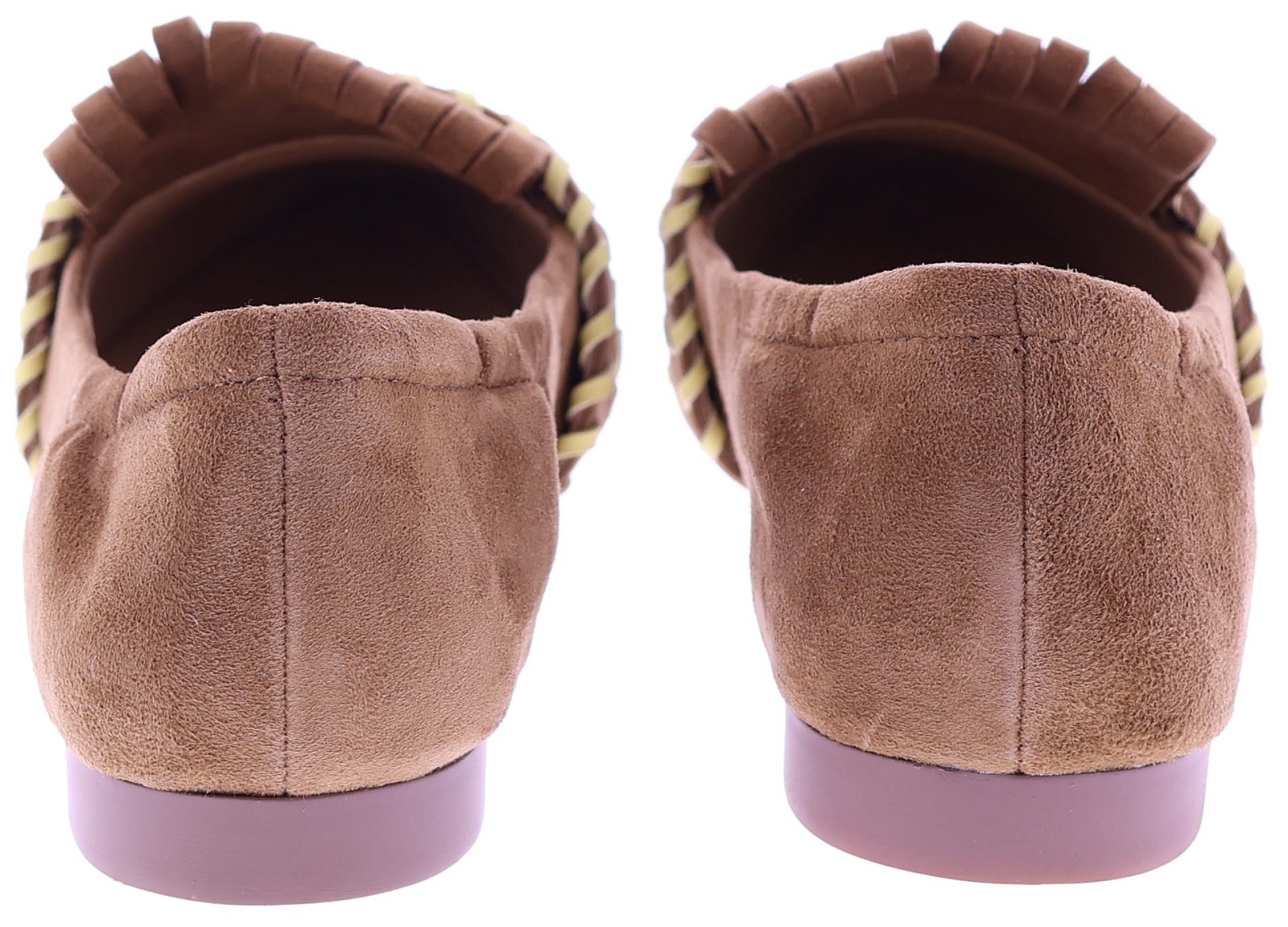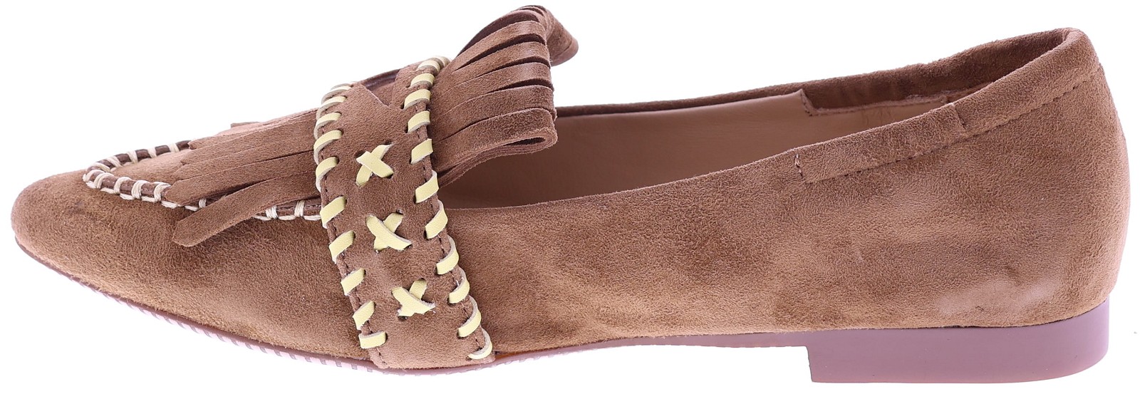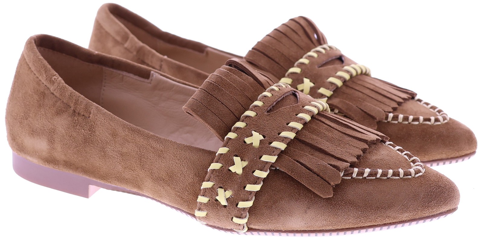 Medium brown suede women's slip-ons by Maripé, model MA152. This playful loafer features a pointed toe and is finished with fringes and decorative stitching in contrasting shades. The soft leather lining ensures comfortable wear, while the subtle 1 cm heel gives the shoe an elegant balance. A slip-on that pairs effortlessly with both casual trousers and an airy dress. Also discover the other women's slip-ons by Maripé at Klijsen.