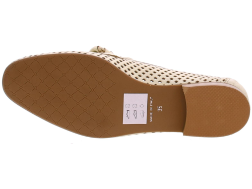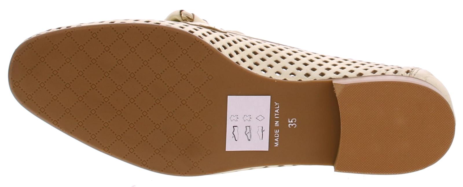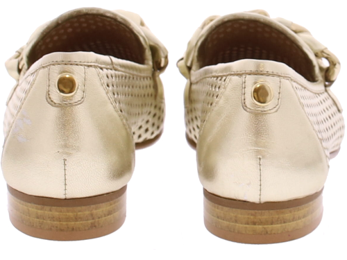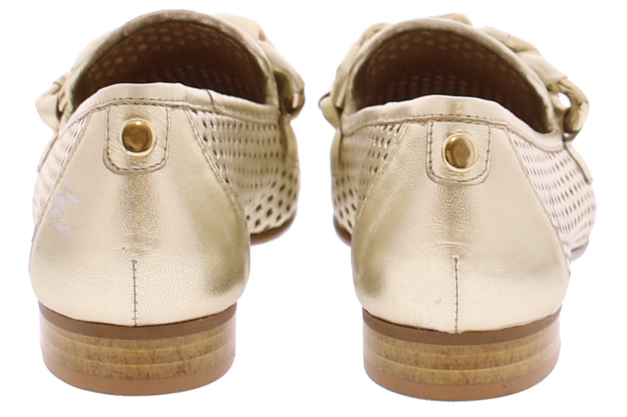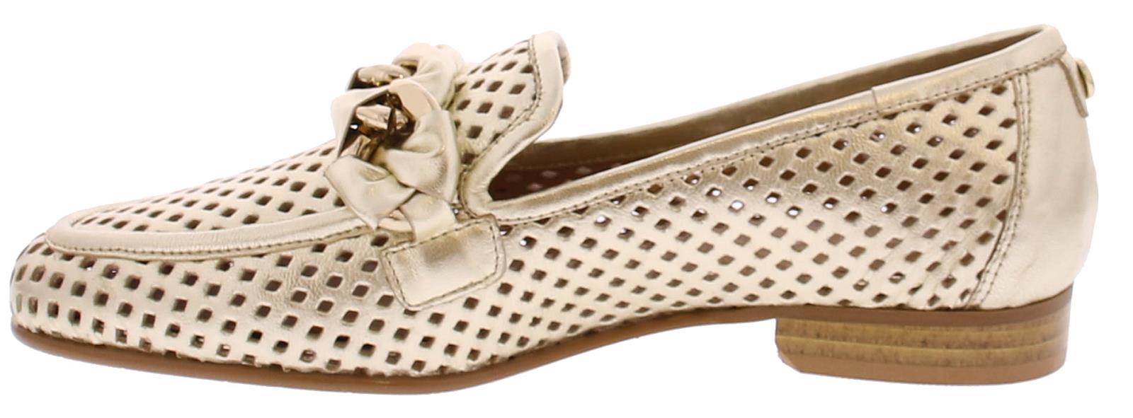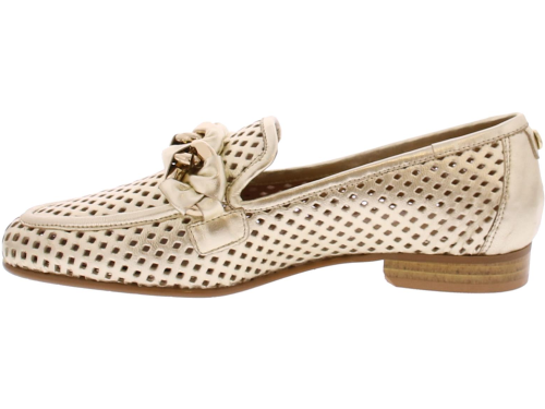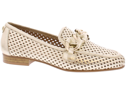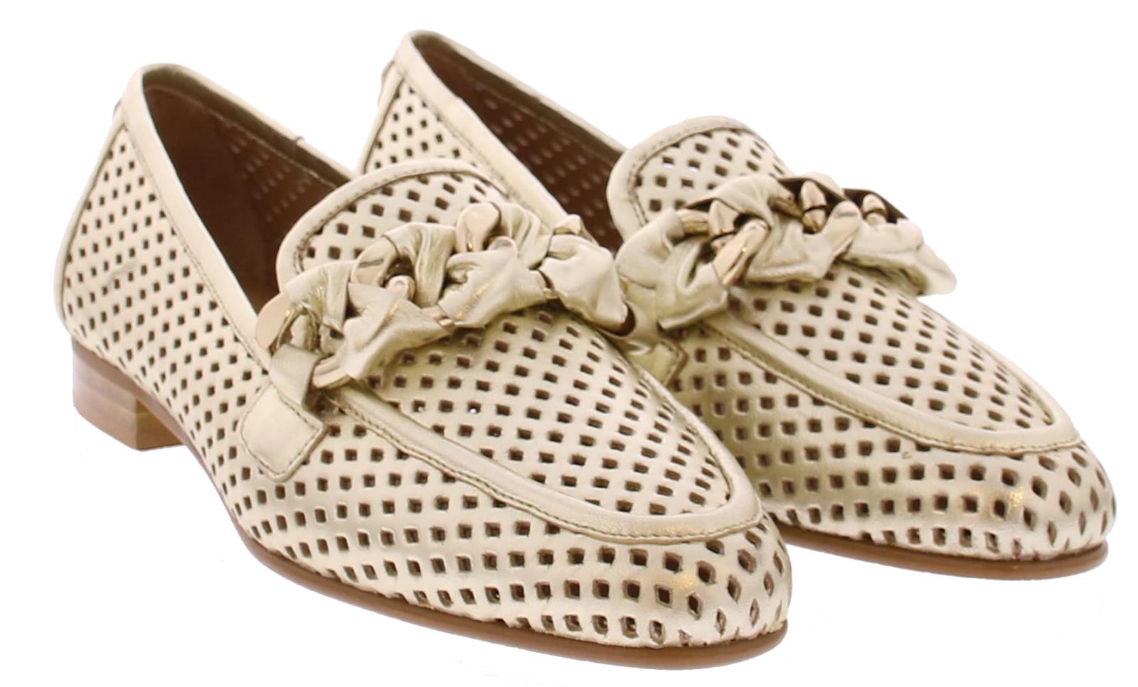 Platinum leather women's loafer by Nalini. This loafer has a perforated pattern for a summery look, on the instep a bit of metal that is partly surrounded by leather in the same color. The inside is leather-lined and has a fixed footbed. The heel has a height of 2 cm.