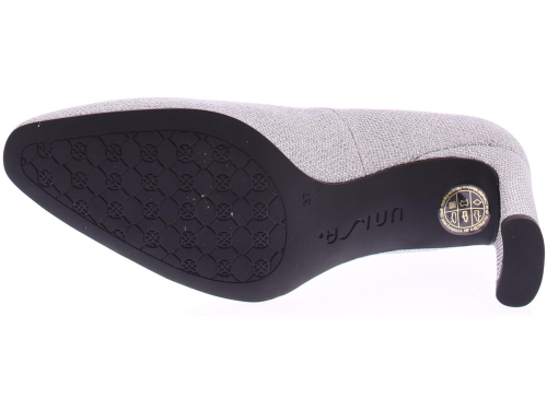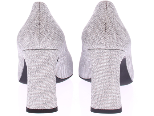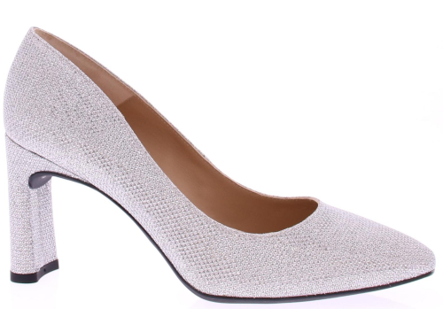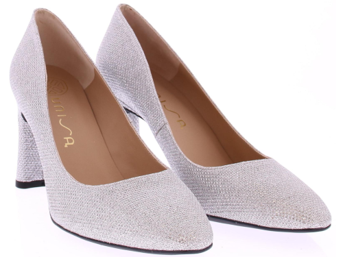 Silver glitter fabric women's pump by Unisa. This classic model completes your outfit, such as the slim design and the rectangular heel. The pump is equipped with a leather lining and a fixed extra soft footbed. The straight heel is 8 cm high. A matching bag is available with this pump.