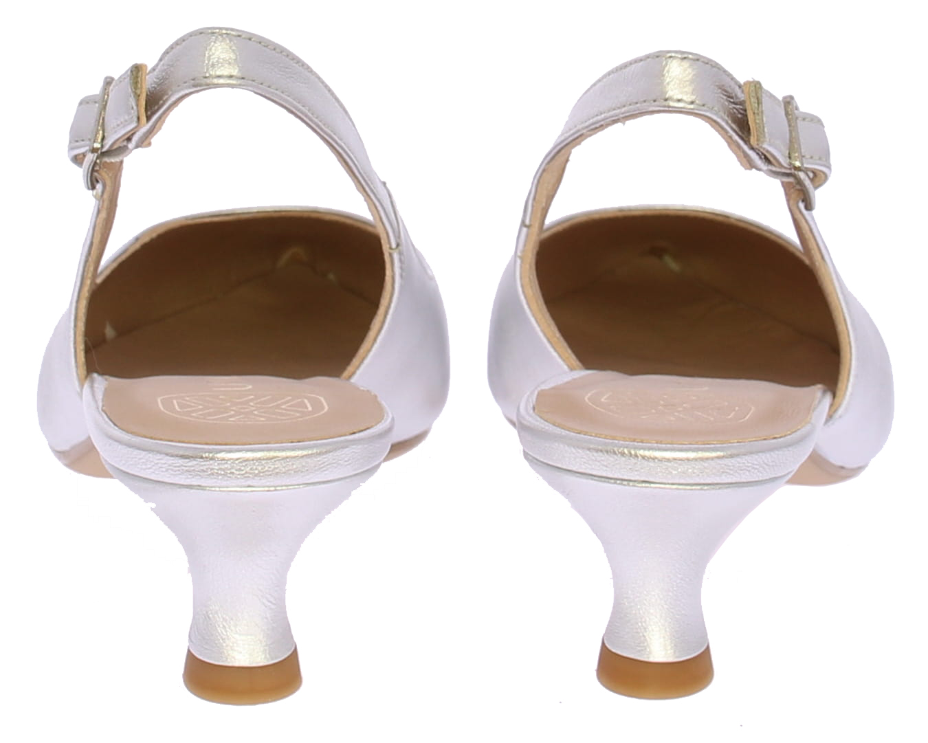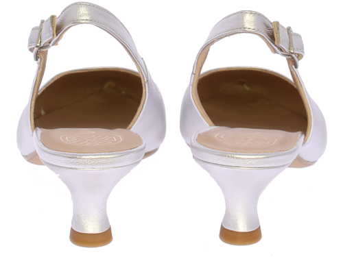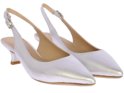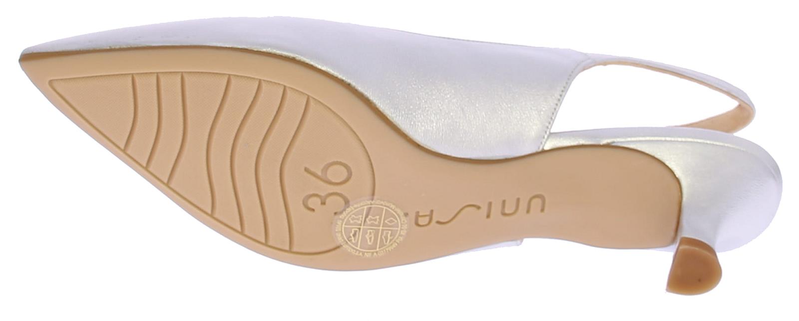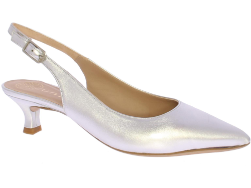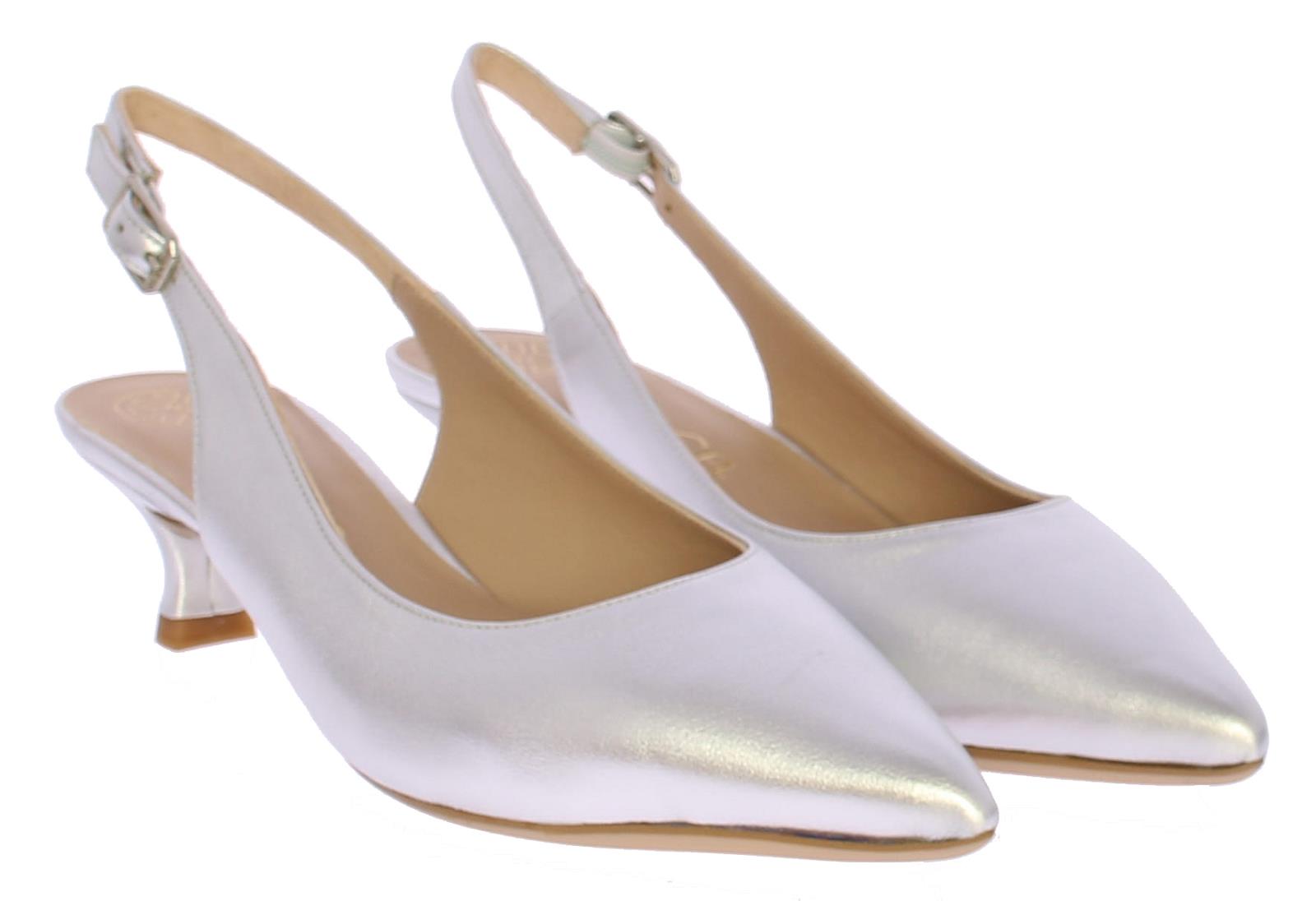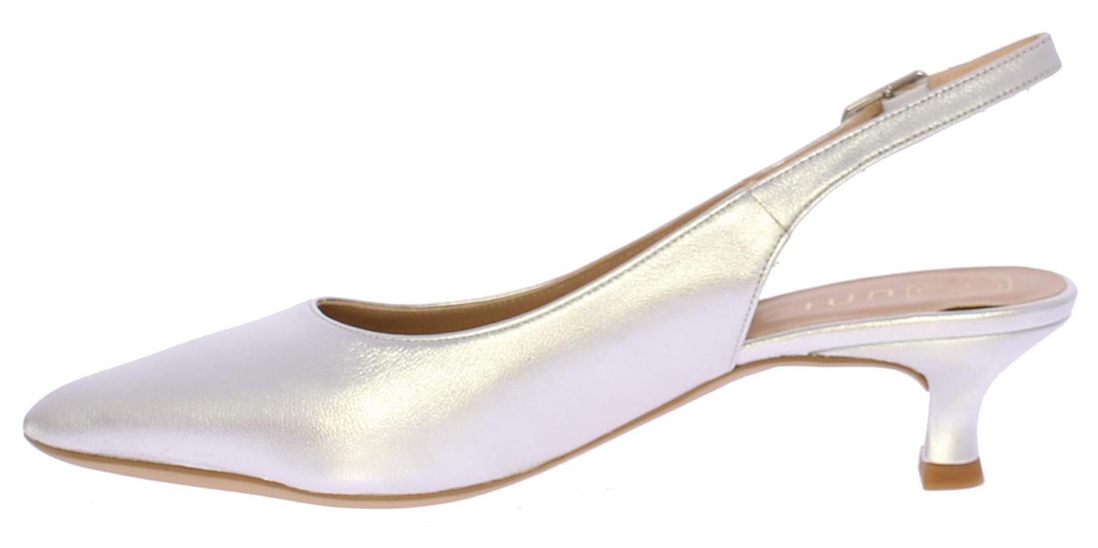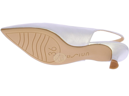 Silver-coloured leather women's slingback pump by Unisa. The strap around the ankle can be adjusted with a silver-coloured buckle. The nose is slightly more pointed and it has a queenie heel of 4 cm. A matching bag is available with this shoe.