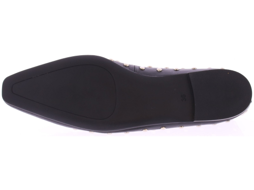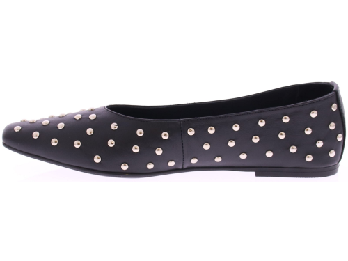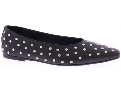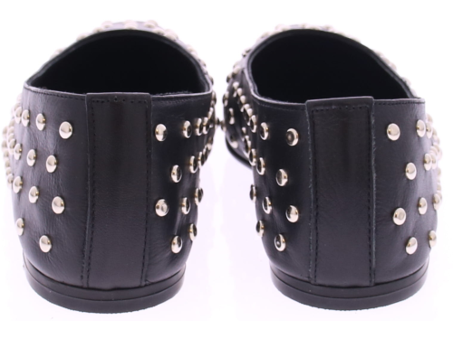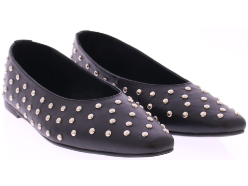 Miss Behave's black leather studded ballerina flats, the Rea 1-r. These stylish ballerinas are crafted from beautiful soft black leather and finished with silver studs for a striking yet chic look. This timeless style offers ultimate comfort thanks to the soft leather insole and rubber outsole. Perfect for everyday wear or as an elegant touch under a business outfit.