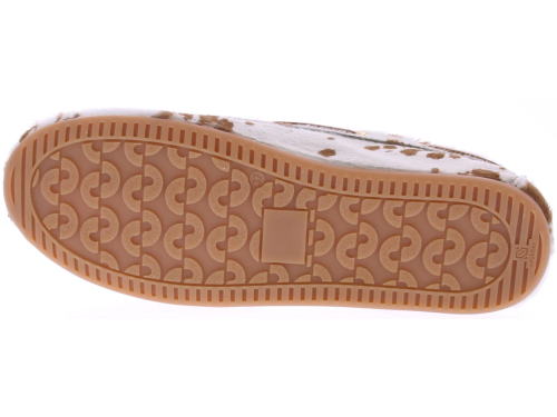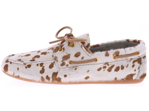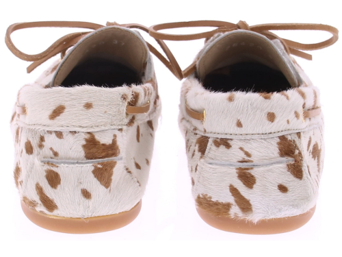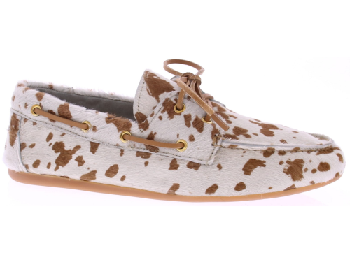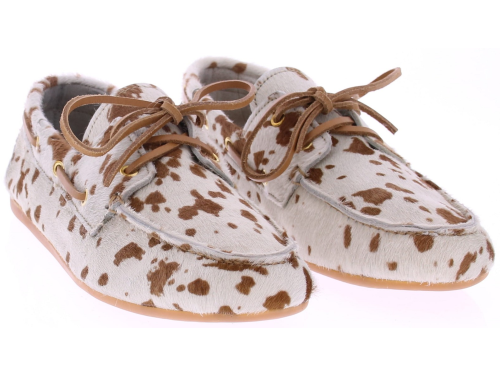 Cow print pony women's boat shoe from Miss Behave. This Miss Behave lace-up shoe features a trendy animal print pony hair and a continuous brown lace for a playful touch. The gold-colored details create a refined look. The leather lining offers extra comfort, while the supple rubber sole ensures comfortable walking. A timeless basic with a fashionable twist!
