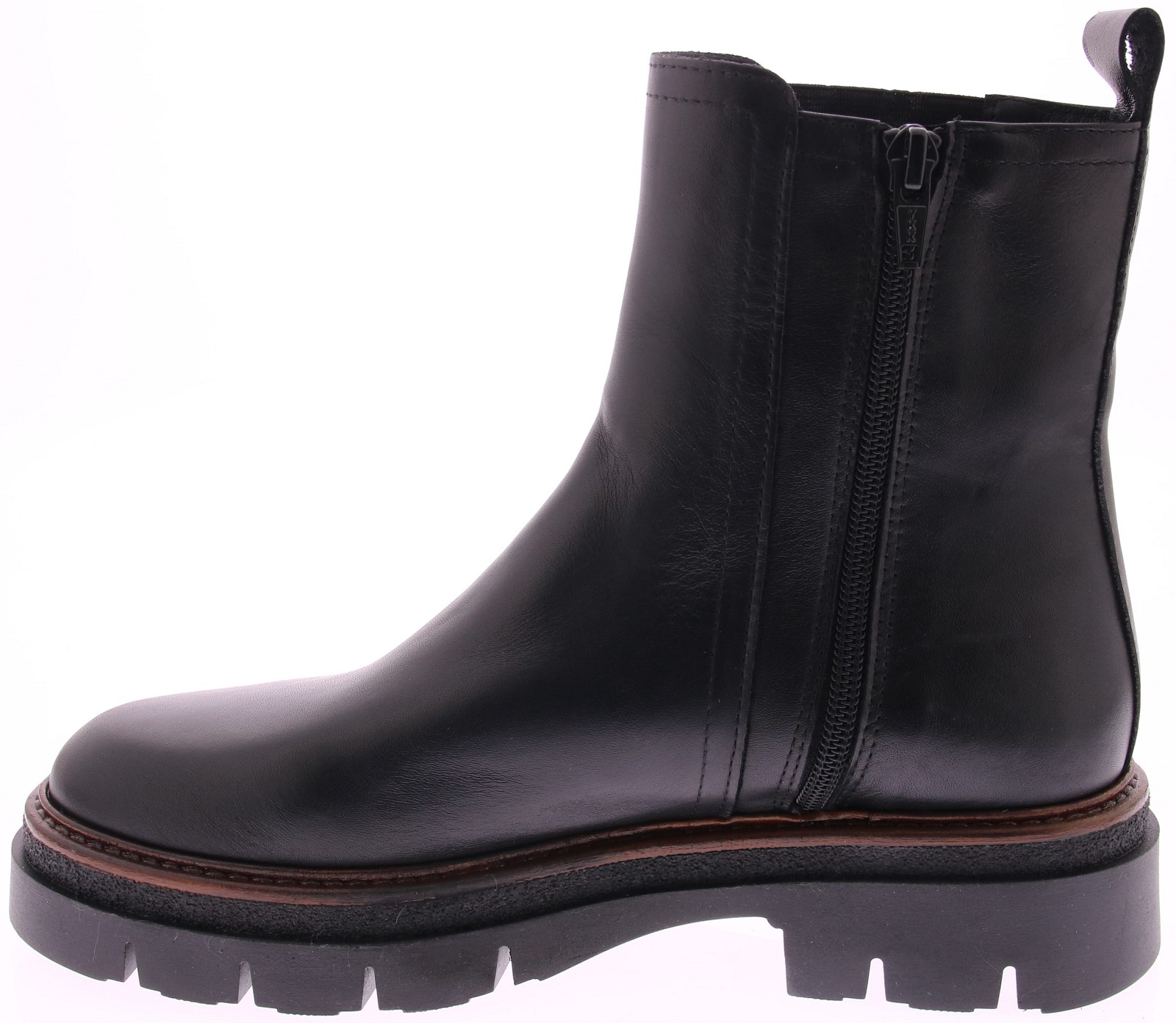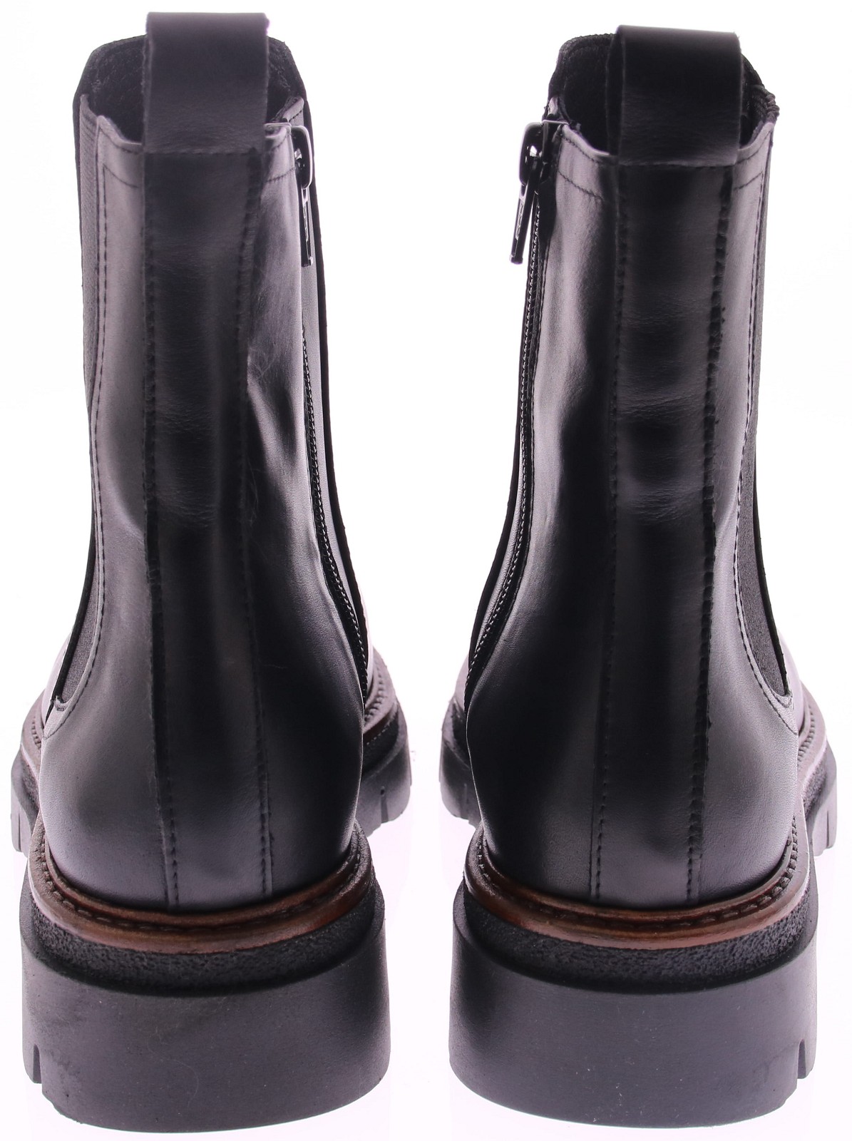 Black leather short Chelsea boot from Miss Behave. This Miss Behave Chelsea boot has a sporty look with a feminine fit. Crafted from supple black leather, it features a handy interior zipper for added convenience, along with the classic elastic insert. The chunky rubber sole provides grip and a rugged look, while the brown sole welt subtly contrasts and gives the boot a refined finish. The lining is full leather. A versatile boot for everyday wear—sporty, stylish, and feminine all in one.