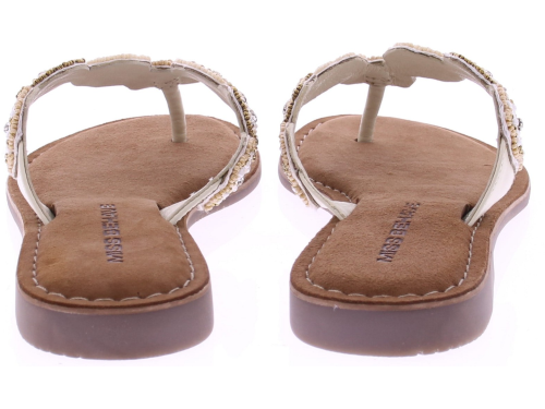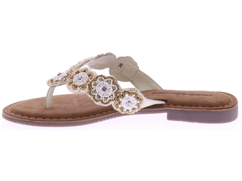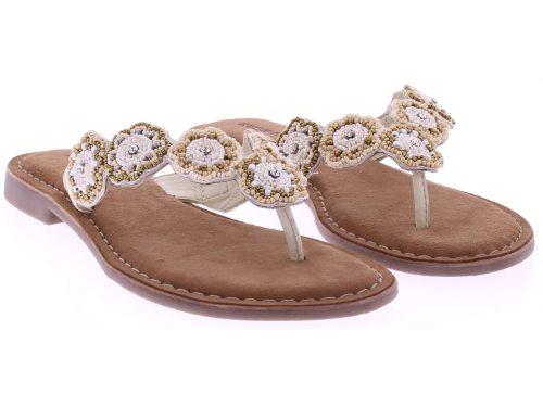 White women's flip-flops from Miss Behave. These luxurious flip-flops feature delicate white and gold beads on the strap and a soft suede footbed for comfortable wear. The toe section is extra soft, allowing the flip-flop to move smoothly and stay comfortable all day long. A summery and stylish style that pairs effortlessly with airy outfits.