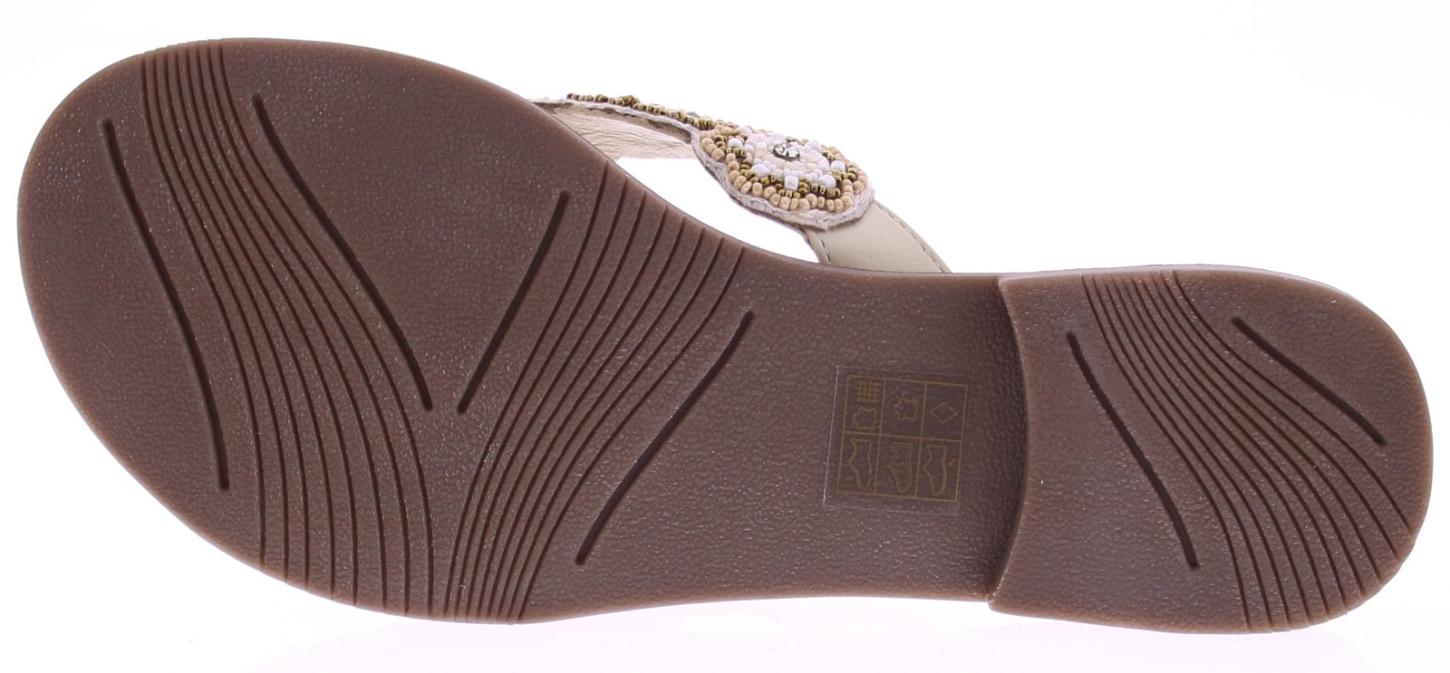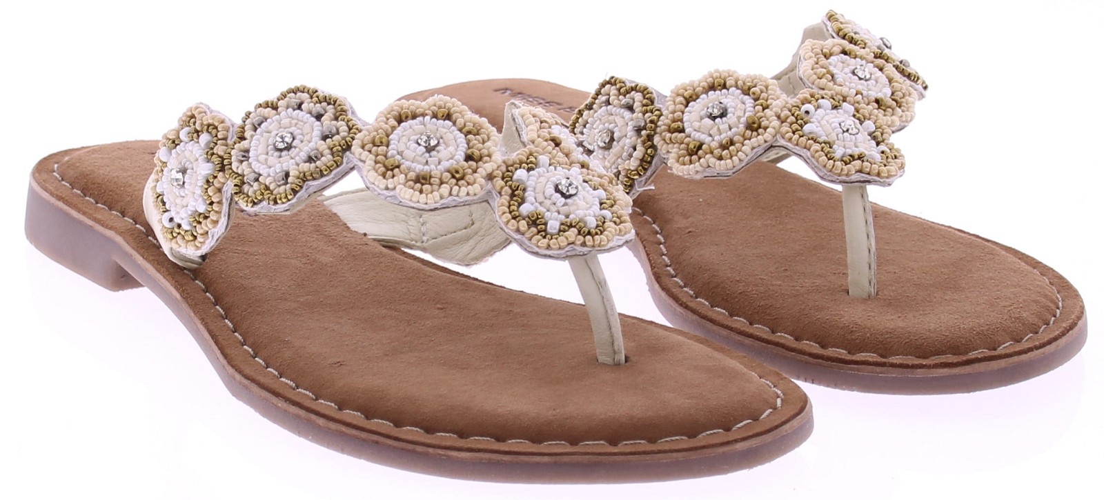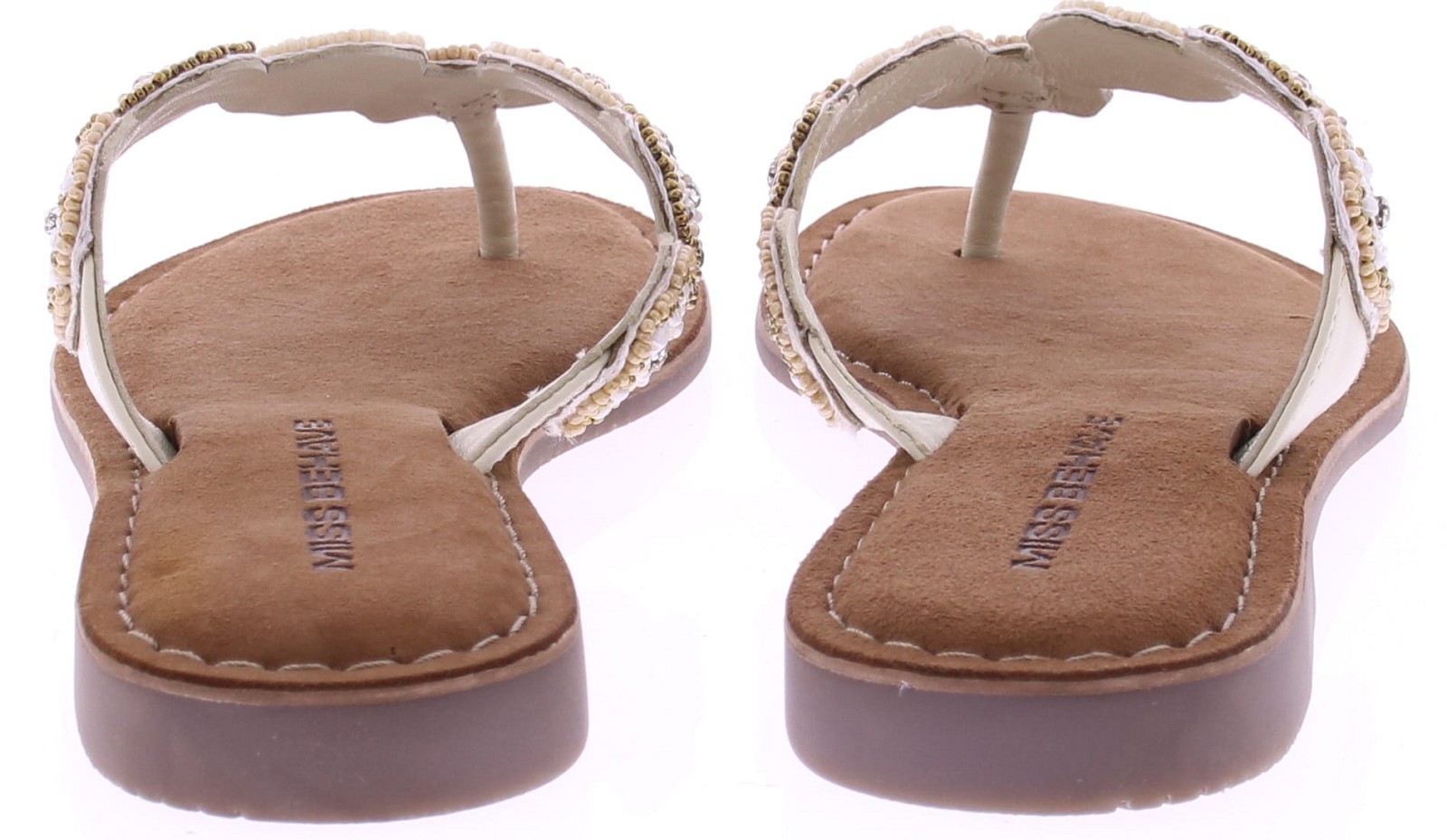 White women's flip-flops from Miss Behave. These luxurious flip-flops feature delicate white and gold beads on the strap and a soft suede footbed for comfortable wear. The toe section is extra soft, allowing the flip-flop to move smoothly and stay comfortable all day long. A summery and stylish style that pairs effortlessly with airy outfits.