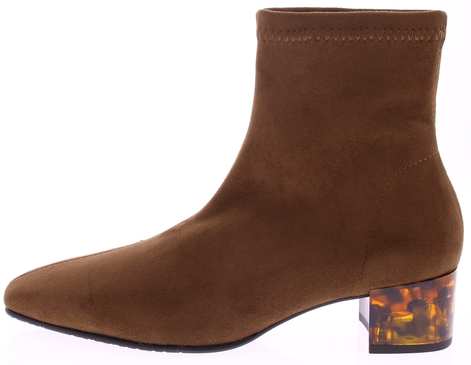 Cognac-colored stretch fabric women's short boot from Miss Elastic. This contemporary short women's boot from Miss Elastic is made of a comfortable stretch fabric that fits snugly around the ankle. A nice detail is the 4cm tortoiseshell heel. The rubber sole provides good grip and flexibility while walking. A perfect combination of comfort and flair – ideal for everyday wear or a trendy city look.