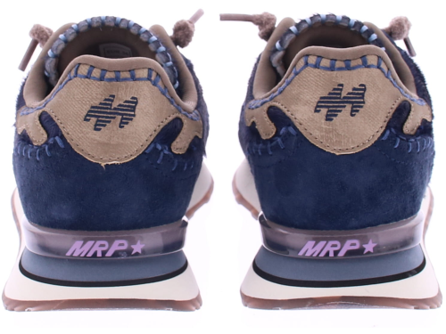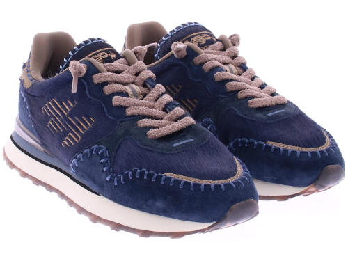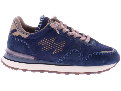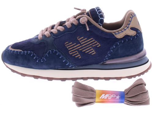 Dark blue mix of black pony hair (hairy cow) and soft suede women's sneakers from MRP. The chunky decorative stitching gives these trendy sneakers a rugged edge, while the bronze accents provide a refined finish. The sneakers feature elastic laces for added comfort, but also come with a classic lace in the box—so you can customize your look. Thanks to the comfortable fit and removable footbed, these are the ideal fashion sneakers.