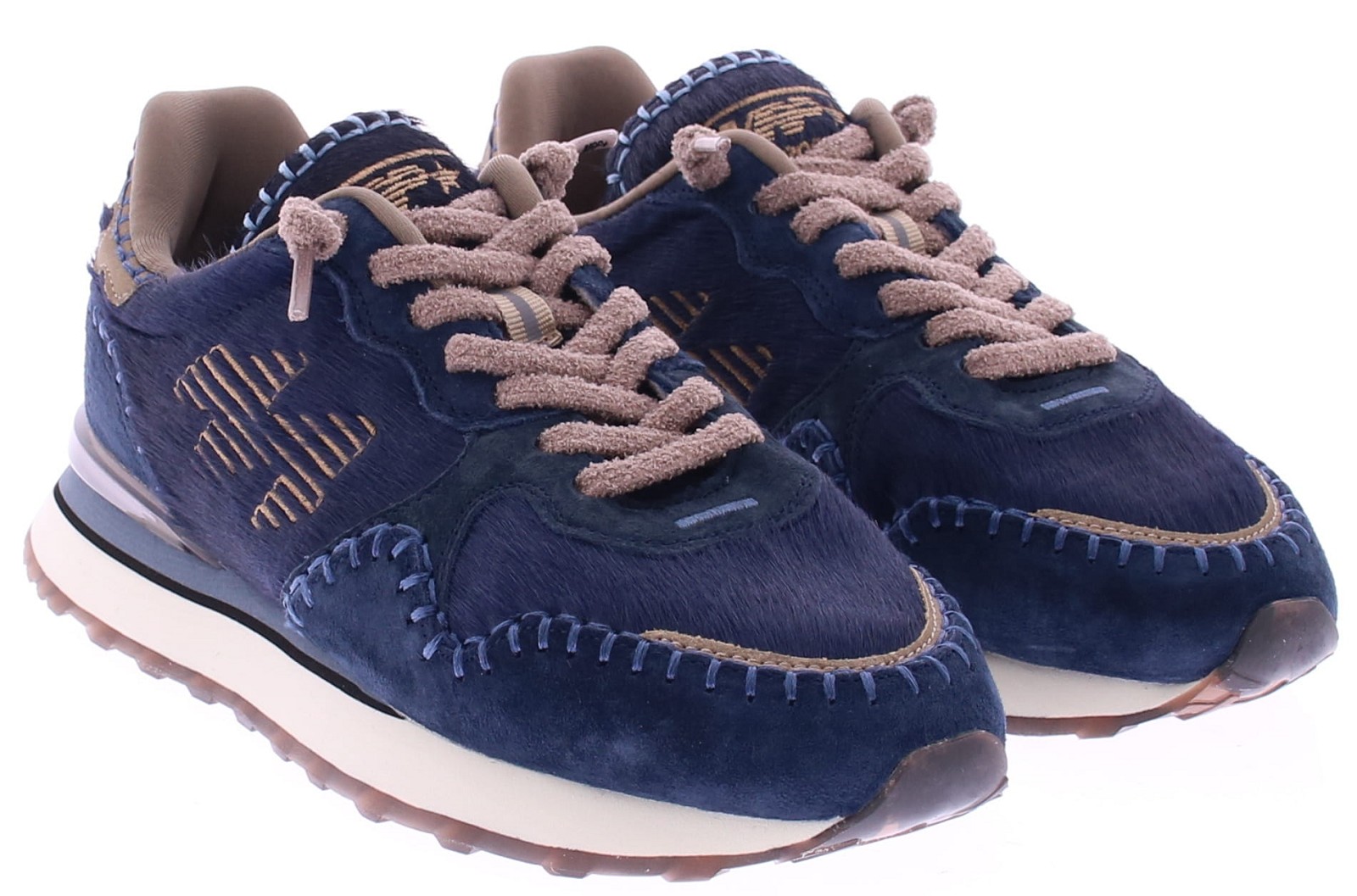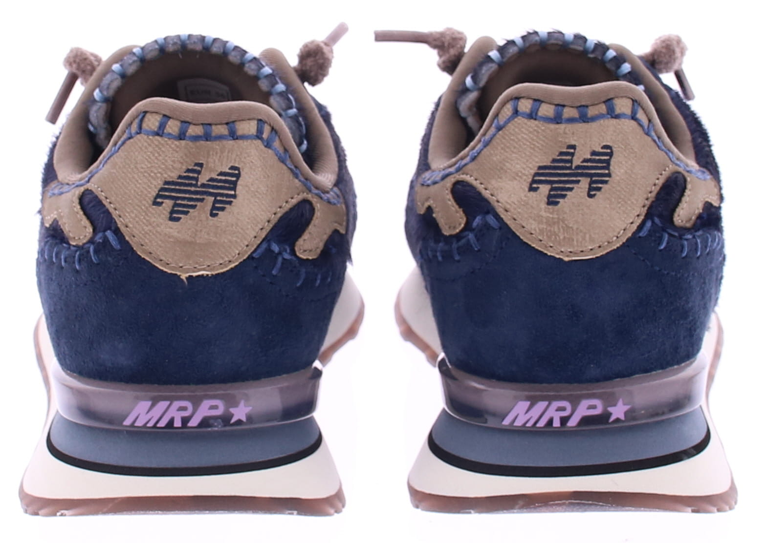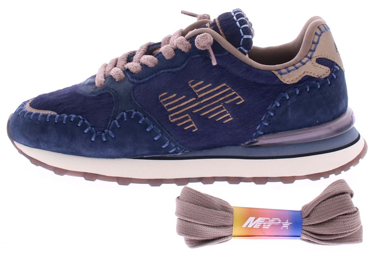Dark blue mix of black pony hair (hairy cow) and soft suede women's sneakers from MRP. The chunky decorative stitching gives these trendy sneakers a rugged edge, while the bronze accents provide a refined finish. The sneakers feature elastic laces for added comfort, but also come with a classic lace in the box—so you can customize your look. Thanks to the comfortable fit and removable footbed, these are the ideal fashion sneakers.
