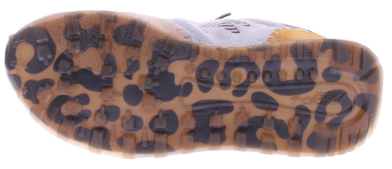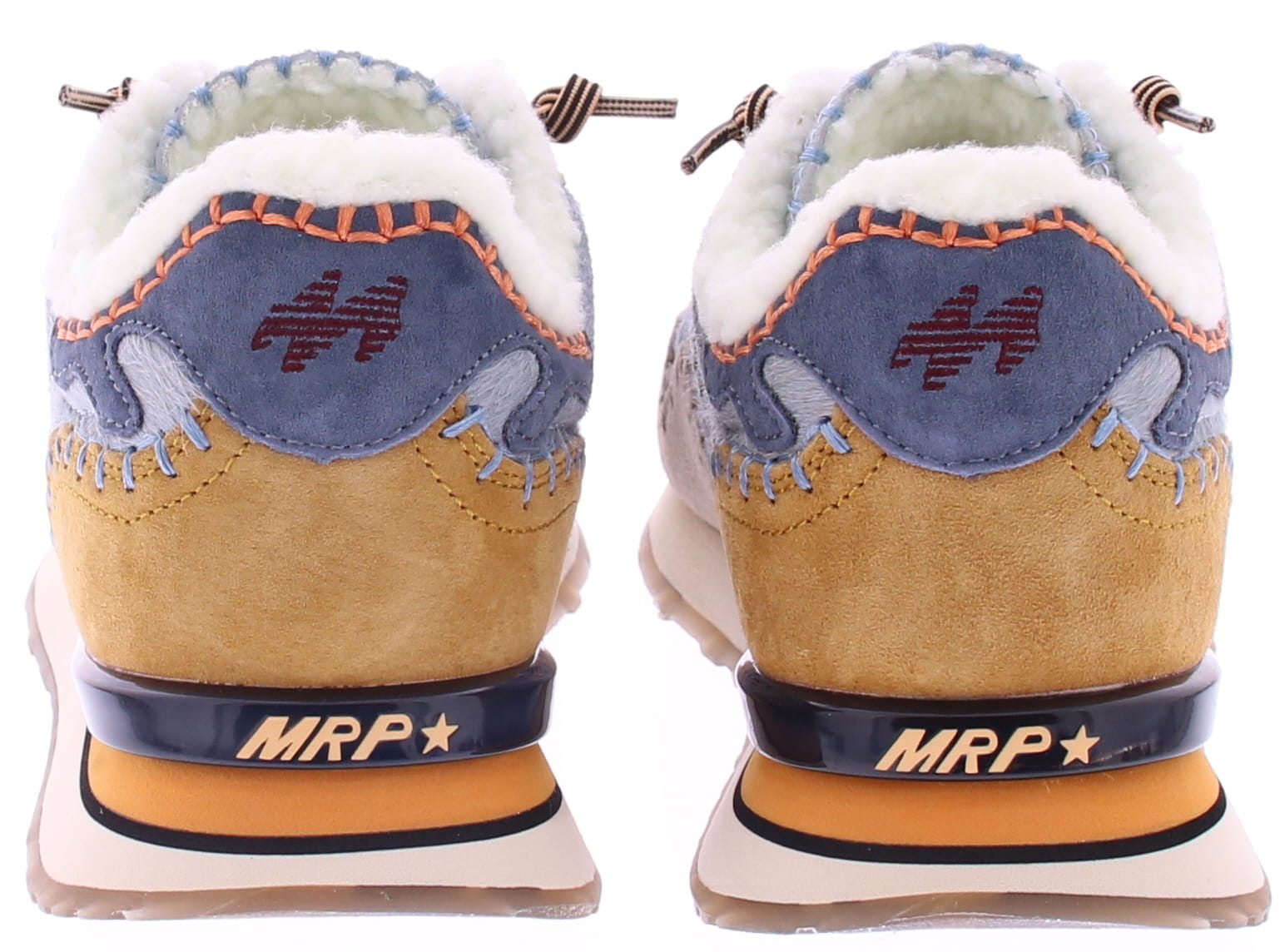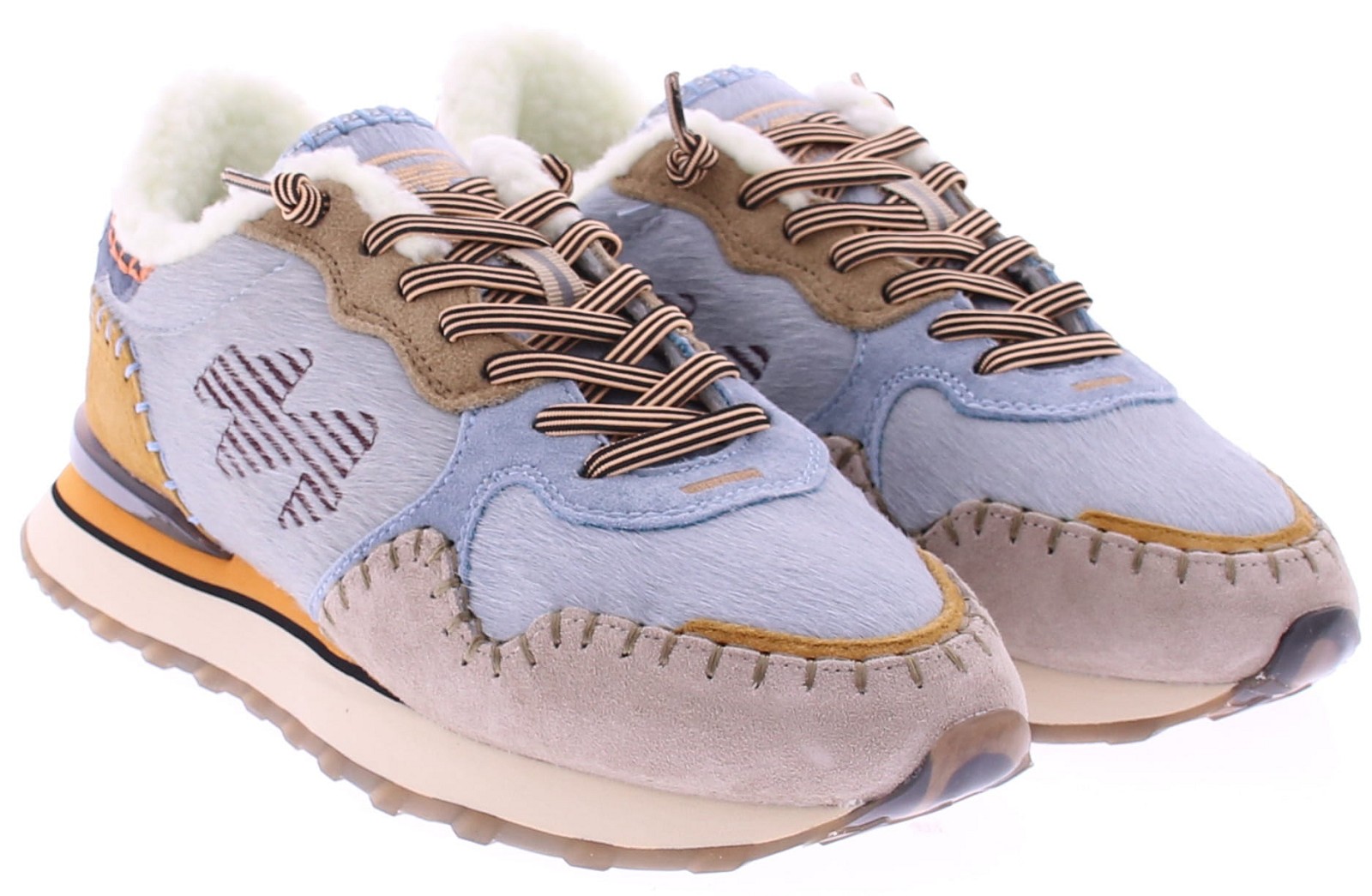 Light blue mix of pony hair (hairy cow) and beige suede women's sneakers from MRP. The chunky decorative stitching gives these trendy sneakers a cool edge, while the orange accents provide a refined finish. The sneakers feature elastic laces for added comfort, but also come with a classic lace in the box – allowing you to customize your look. The lining is made of a wonderfully warm synthetic fur (sides only). Thanks to the comfortable fit and removable footbed, these are the ideal fashion sneakers.