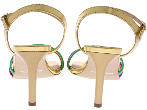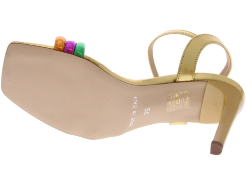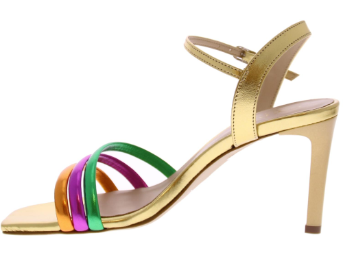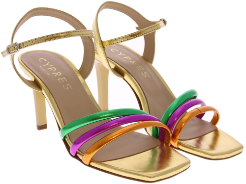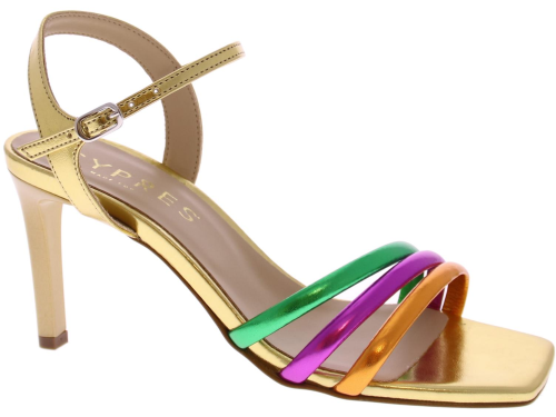 Multicoloured women's sandal by Cypres. This sandal has three metallic straps over the forefoot, in the colours orange, pink and green. The heel is straight in a matt gold colour and has a height of 8 cm.