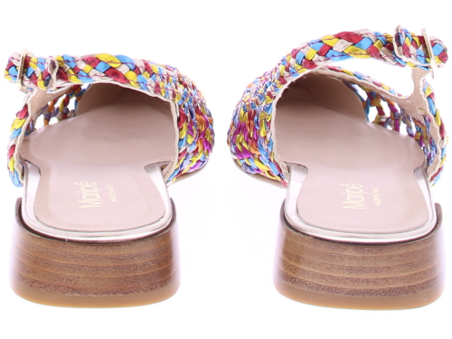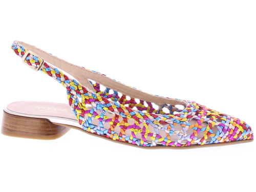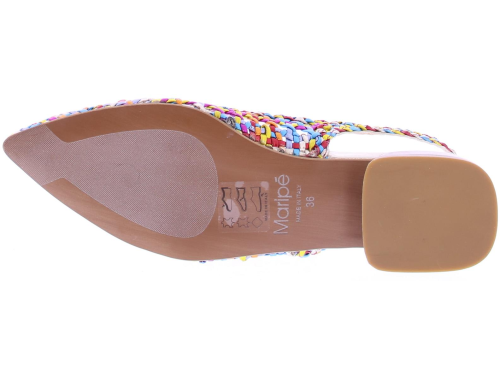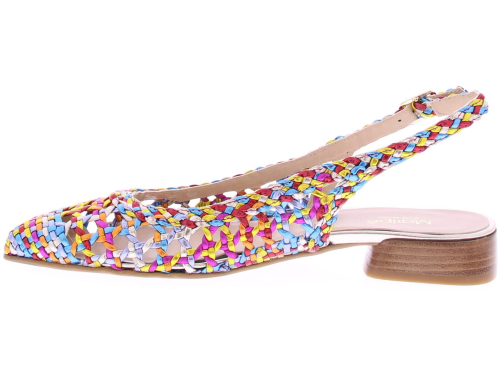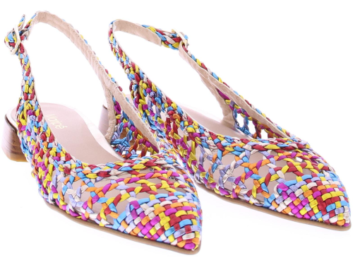 Multicoloured leather ladies slingback pump by Maripe. This openwork braided slingback has a gold buckle. Both the outside and inside are made of leather. The pump has a comfortable heel height of 2 cm.