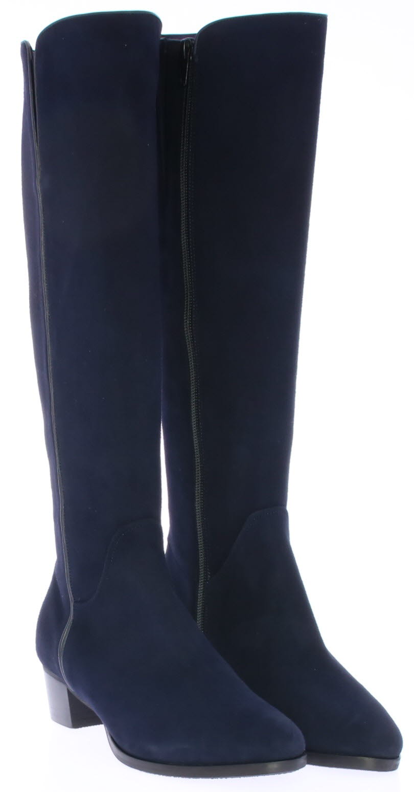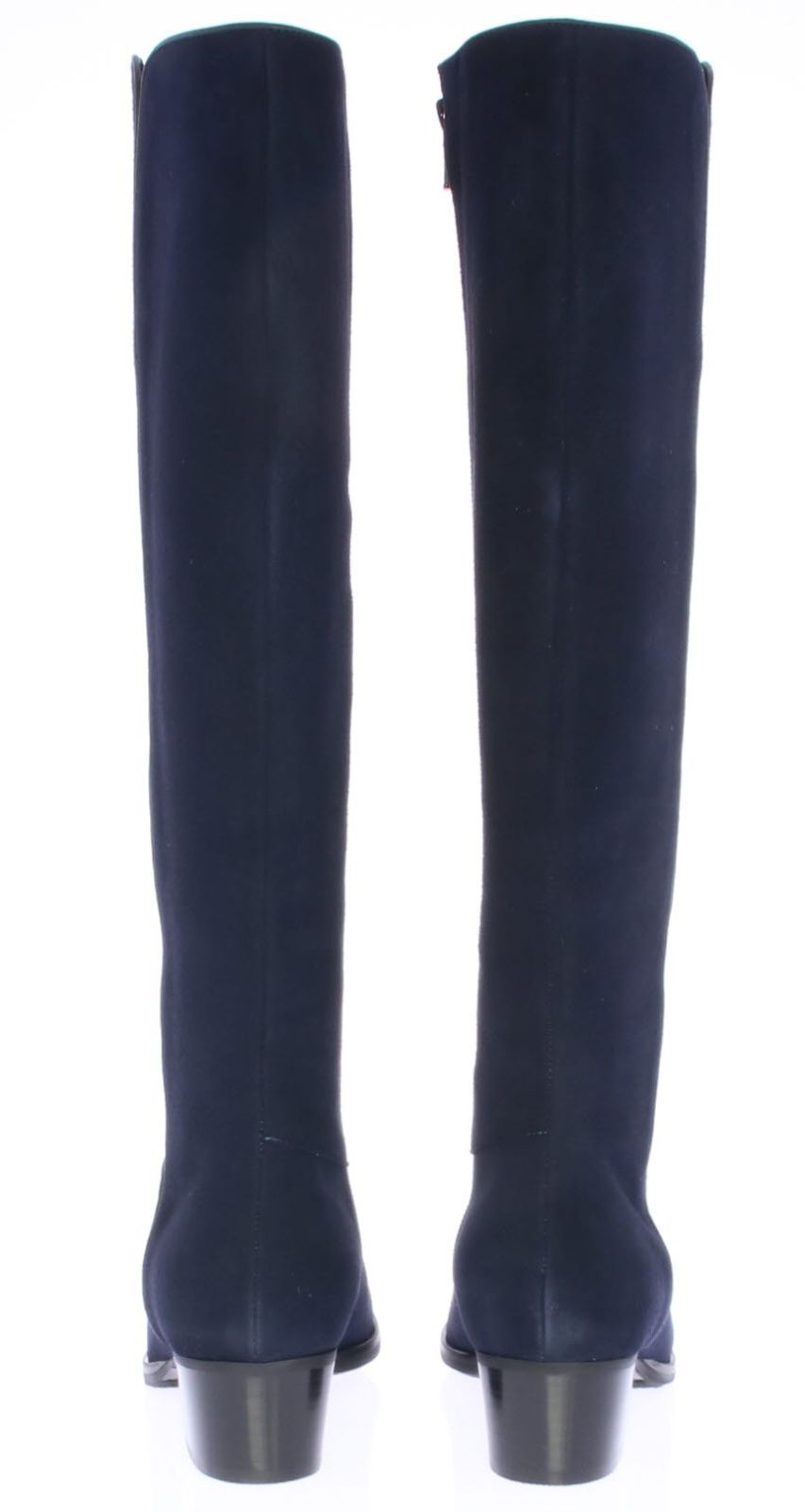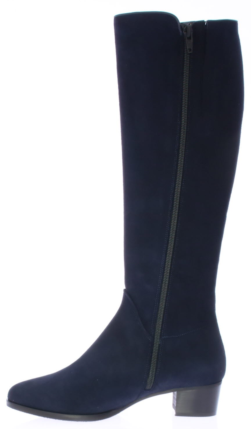 Dark blue suede women's boot from Nalini. The boot has an XS shaft, meaning it's suitable for a narrower calf. This tall boot is finished with a leather trim along the entire shaft. The heel is 3 cm, and the shaft is slightly higher at the front than at the back.