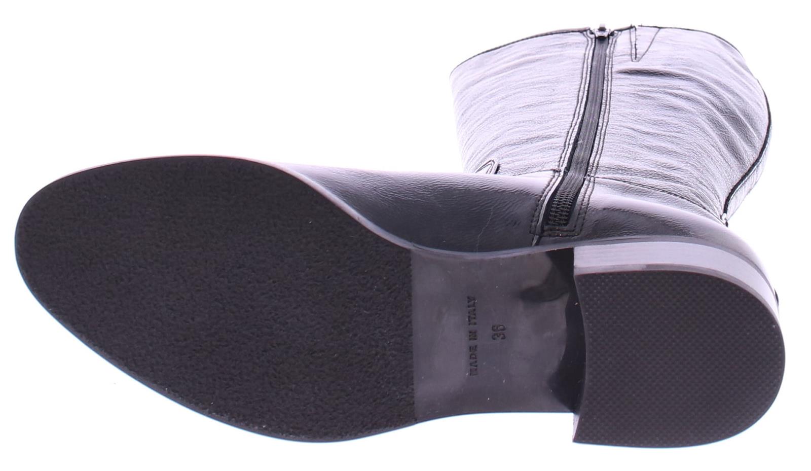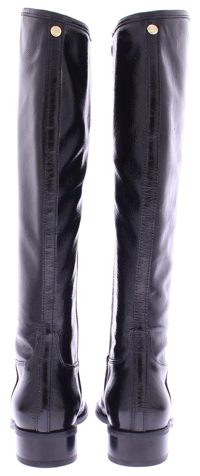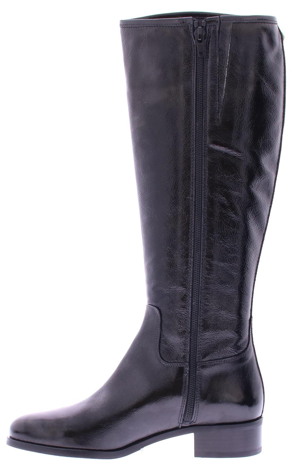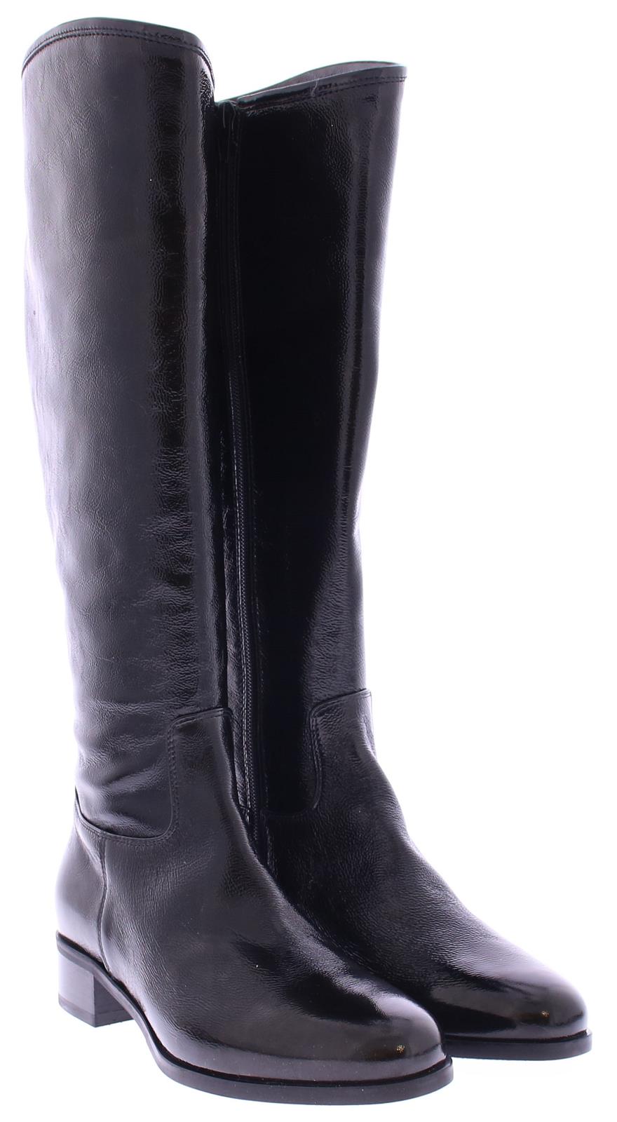 Black patent leather long women's boot by Nalini. Made with a regular shaft width on an oval last with a 2 cm heel. There is a zipper on the inside. And they are completely lined with leather.