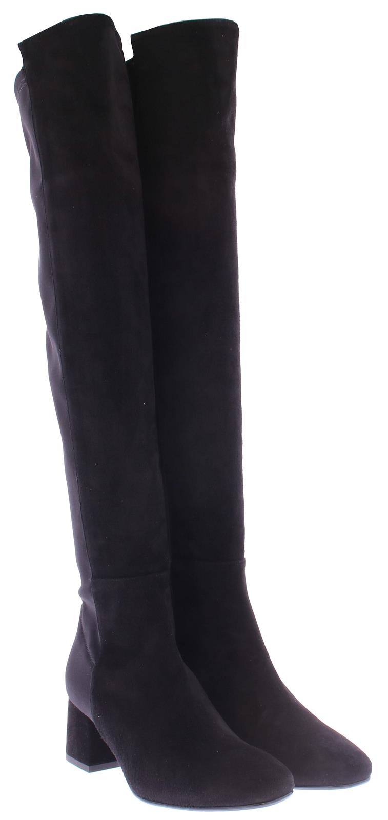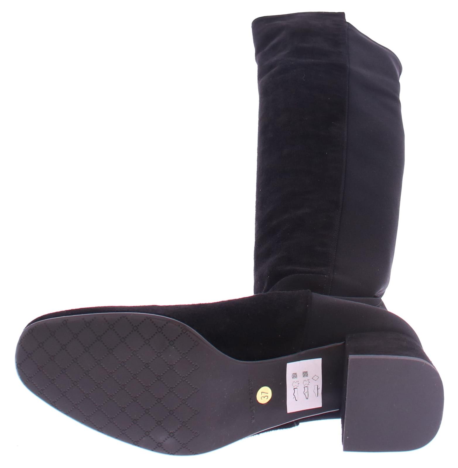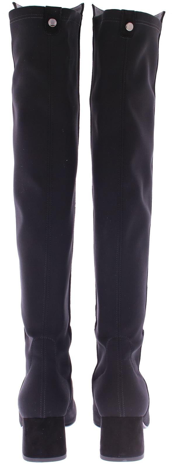 Black suede with fabric ladies long boot by Nalini. The back part of the shaft is made of sturdy luxury stretch fabric. The rest of the boot is suede. This boot falls over the knee. Due to the stretchy fabric they fit nicely around each leg. The oval last is timeless and the comfortable intermediate heel is 5 cm high.