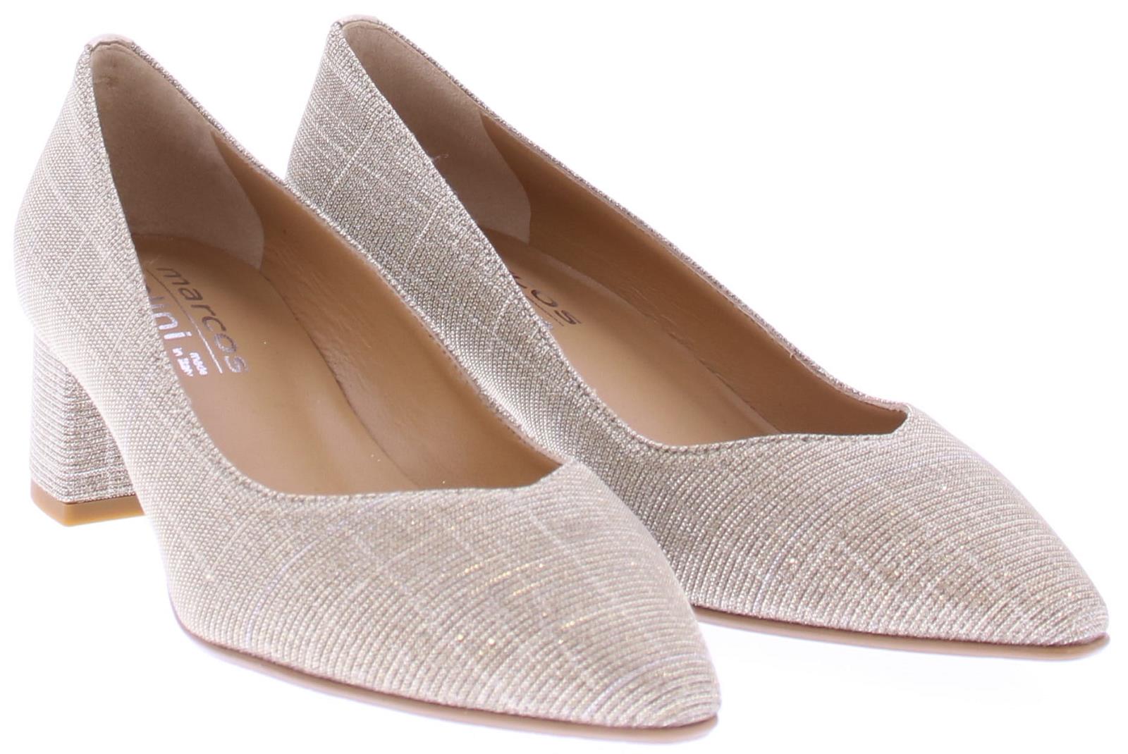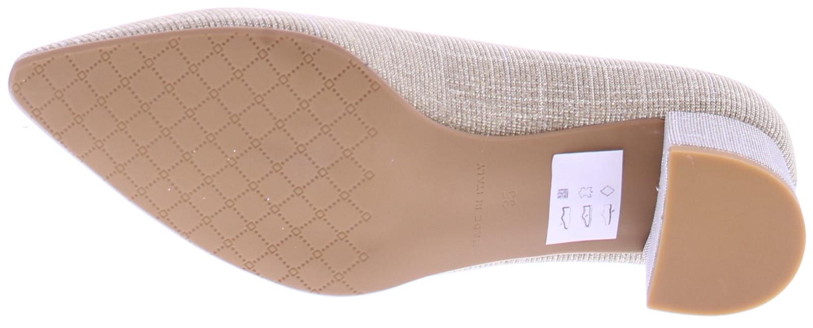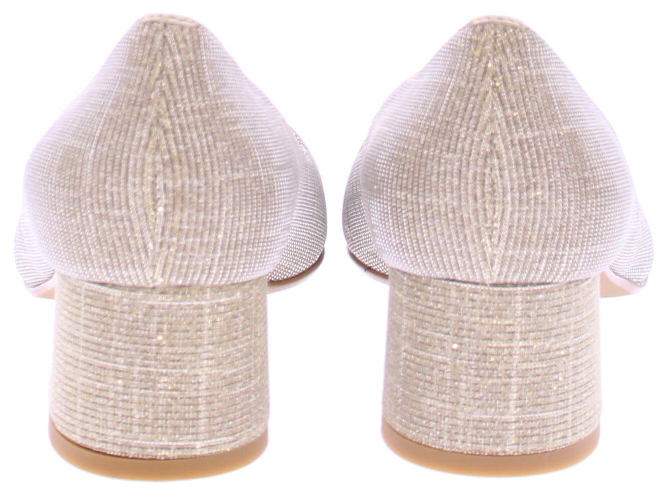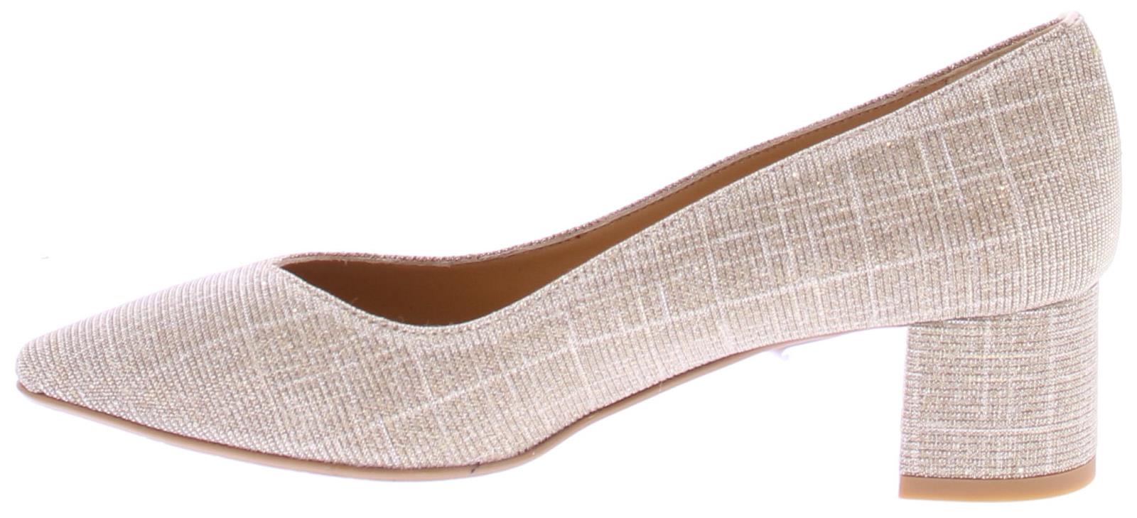 Gold Platinum fabric women's pump by the brand Nalini. The covered, comfortable heel has a height of 5 cm. The V-cutout gives the pump an elegant look.