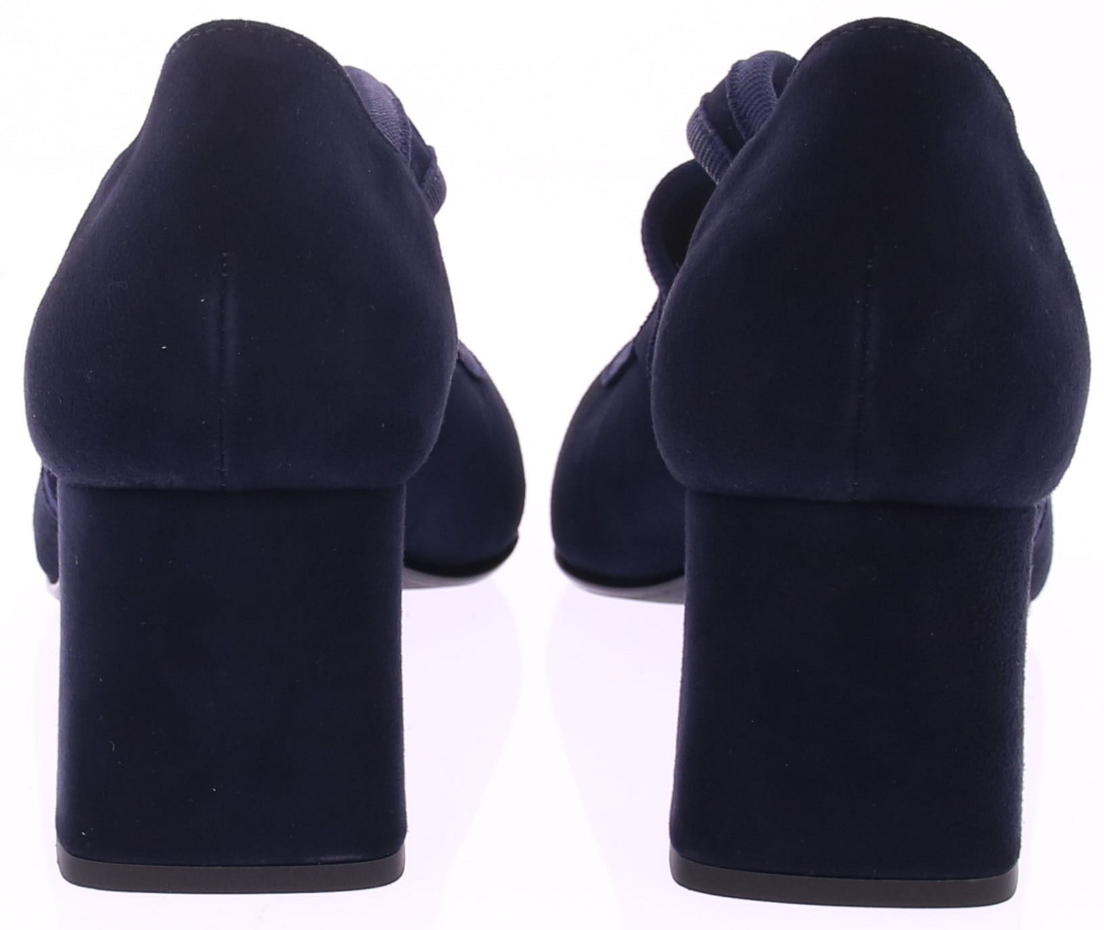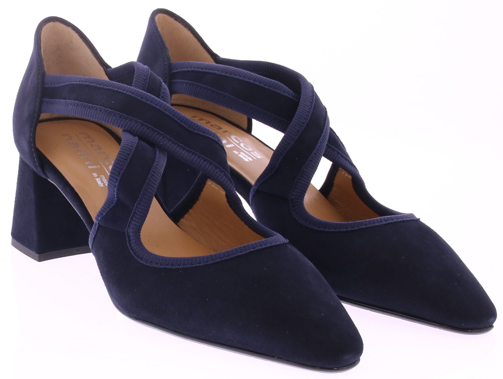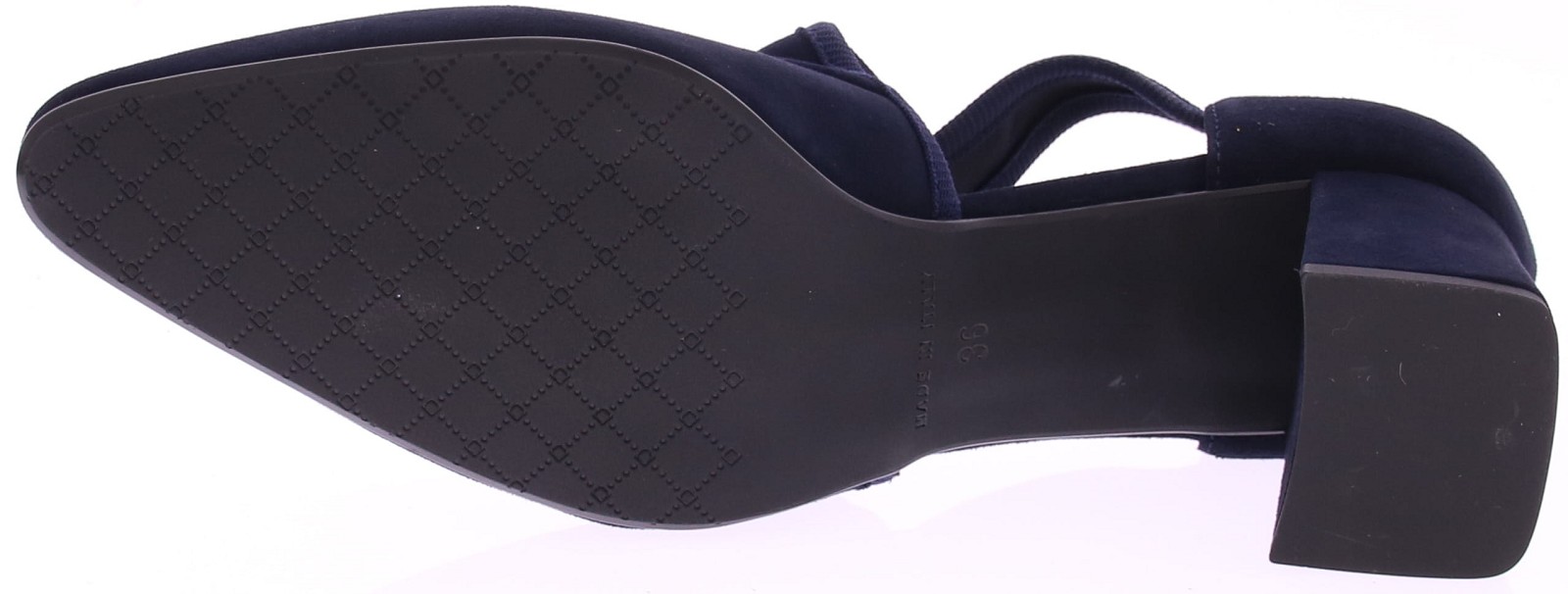 Dark blue suede women's pumps from Nalini. Featuring elastic, crossed straps on the stretch suede instep. The comfortable heel is 5 cm high. The sole is made of thin rubber, and the shoes are lined with leather.